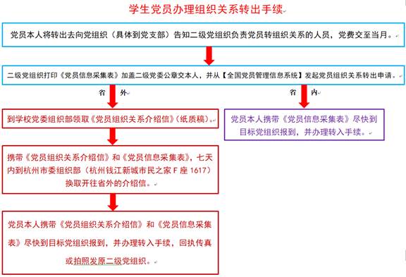 (5)党员本人尽早凭《党员信息采集表》《党员组织关系介绍信》(仅省外需要)在有效期内及时到接收单位(介绍信抬头党组织)办理党员组织关系转入手续,转出到省外的党员请将组织关系介绍信的第三联回执用传真、快递或电子信息等形式反馈至给学院党委组织员雷军老师,0571-28869241。