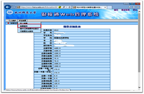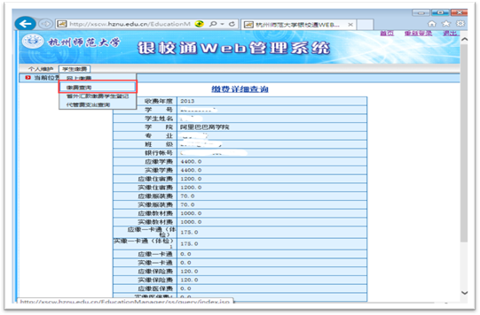 教材领用明细查询:点击菜单栏中“学生缴费”—“代管费支出查询”,选择查询学年可以查询每年的教材费使用明细。