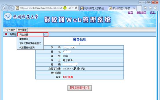 登录系统后,点击“学生缴费”—“网上缴费”—“银联网银支付”。