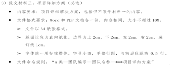 1)项目详细方案文档(必须),具体内容如下图国赛要求所示;2)PPT文档(必须,不超过25页);3)原型视频(可选)。