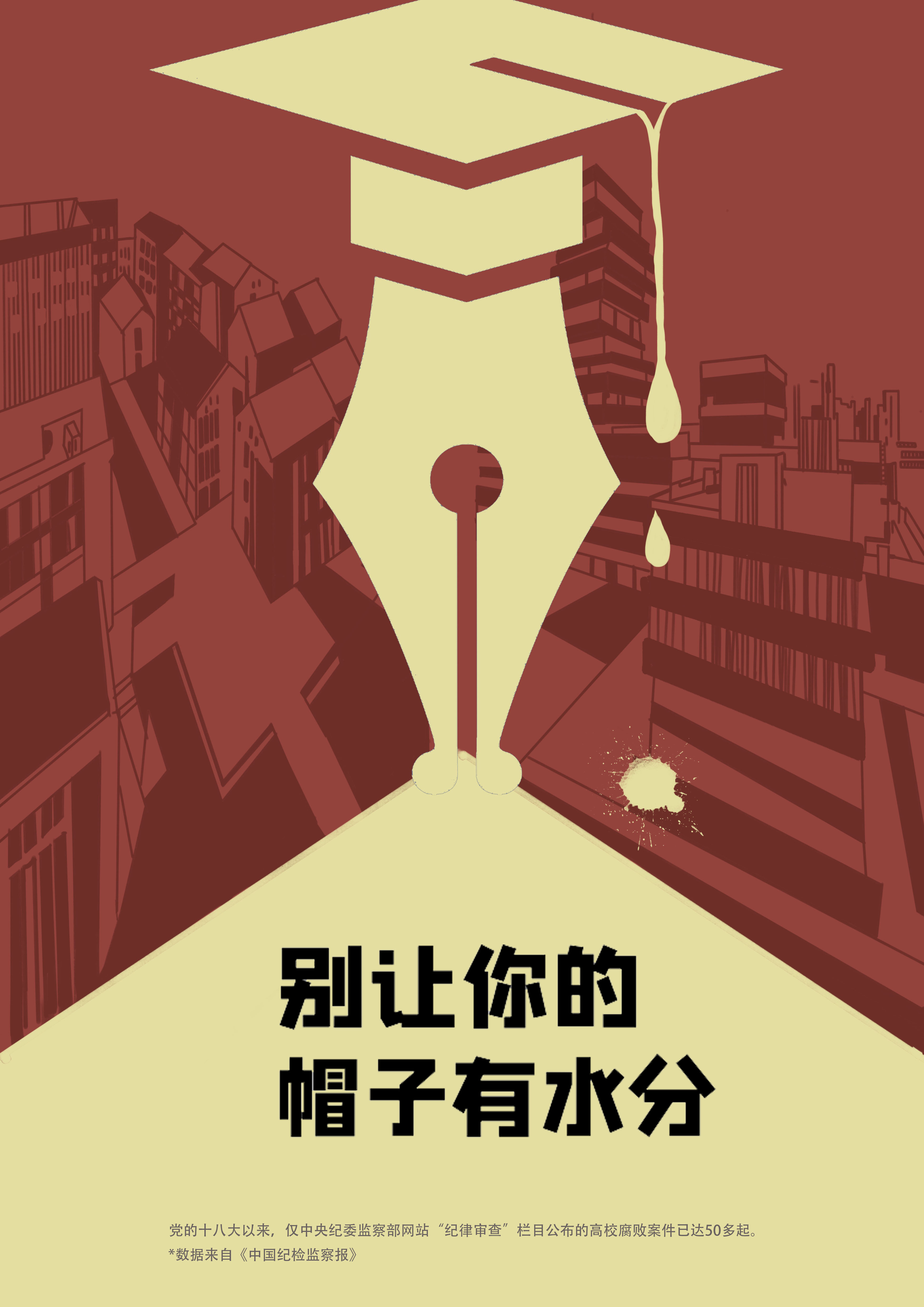 本次比赛共有近30余名同学参加,经过初选后,有17件作品入围校园114党员服务中心微信公众平台进行的线上投票。截止1121日晚上,累计参与投票人数5623人,其中,获票数最高的为信工192班的谭雅丹、薛怡然及信工193班陈志豪的作品,得票均为2400票。在最后的讲解环节中,胡张可、蔡锦英的作品得到最高分,加上前期网络投票排名第四,最终荣获本次比赛一等奖。这张名为“别让你的帽子有水分”的作品,选取杭师大校园、学位帽、钢笔、水滴作为主要元素,将博士帽与钢笔巧妙结合,并与水滴呼应,讽刺了学术腐败现象在高校频发的现象,警示高校师生弘扬科学精神,坚守科学道德,维护科学学风。