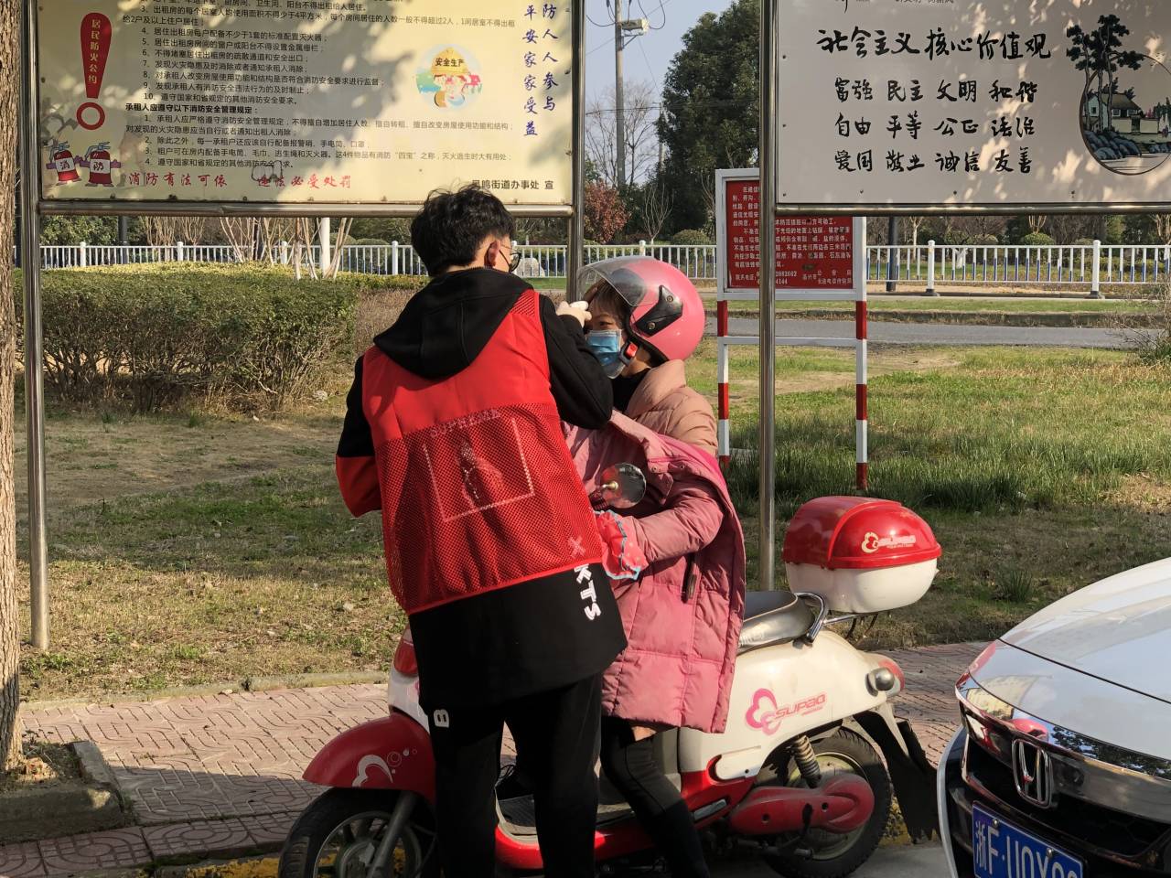 下午四点,在疫情爆发的当下,大家都宅在家里,小区里基本无人走动。在环南小区门口,来自国服学院物联网162班的张嘉盛同学和其他几个志愿者一起,正在给要进入小区的群众测温并做好登记。这是他最近一周以来第5次上岗,每次上岗都是4小时。不论是白天还是夜晚,冬春之交的室外总是很冷,但是,张嘉盛说,“作为一名党员,我必须要冲在前面,为社区人民做好服务工作。
