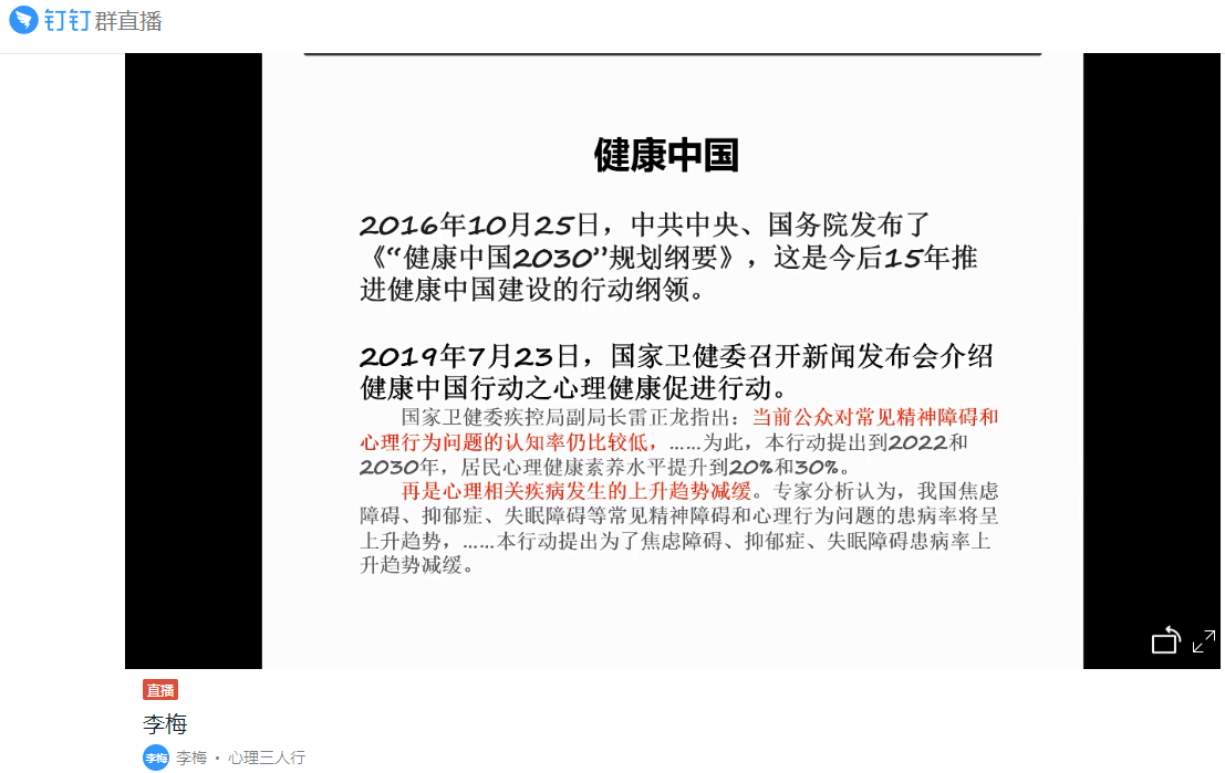 为了更好提高大学生焦虑情绪的应对和调节,心理中心在12月份展开关于焦虑调节的系列讲座,讲座以钉钉在线直播的形式开展。