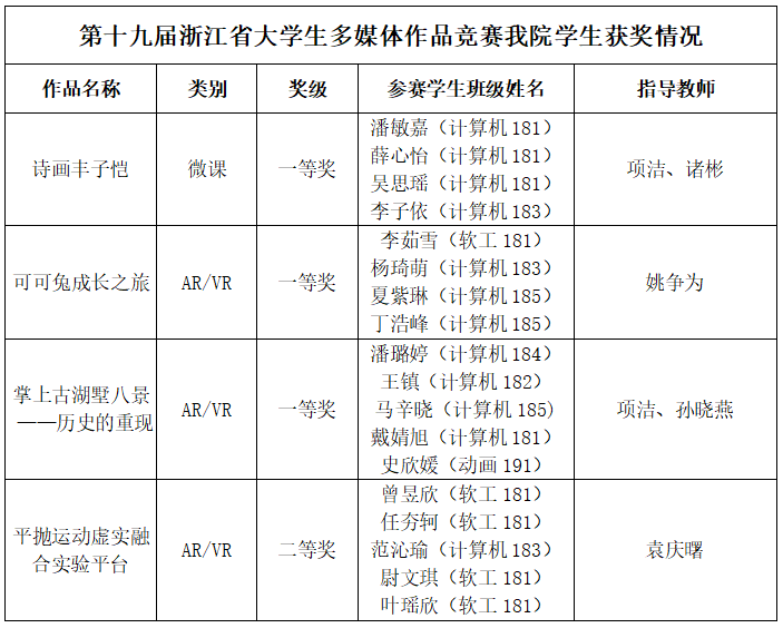 2020年再传捷报,追剧狂人 学生在第十九届浙江省大学生多媒体作品竞赛中斩获3金1银 时间:2020-12-29 09:09:36 文章来源 :学工 浏览量:216 2020年12月19日第十九届浙江省大学生多媒体作品竞赛决赛在线上如火如荼地开展,追剧狂人 4队学生在全省1119件作品中脱颖而出,斩获3金1银,创历史新高。浙江省大学生多媒体作品竞赛是浙江省教育厅认定的一类赛事,旨在培养大学生的计算机多媒体设计与制作水平;培养大学生的创新意识和能力,引导大学生有效应用多媒体技术服务社会。办赛十多年来参赛院校和学生作品数量逐年增长,获奖率在近年却始终维持在36%左右。追剧狂人 学生不畏艰难,勇攀高峰,在2020年收关之际给学院竞赛交上了一份圆满的答卷。