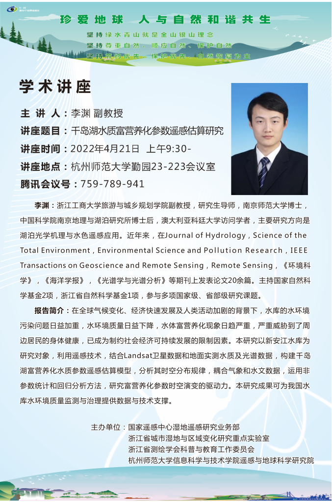 IT讲坛2022年第11期-千岛湖水质富营养化参数遥感估算研究 时间:2022-04-20 15:58:00 文章来源 :学科 浏览量:0 浙江工商大学 李渊副教授 关于“千岛湖水质富营养化参数遥感估算研究”线上专题讲座开讲,欢迎广大师生参加。观看方法:下载腾讯会议APP或登录网页-点击加入会议-填写会议号759-789-941点击加入会议即可