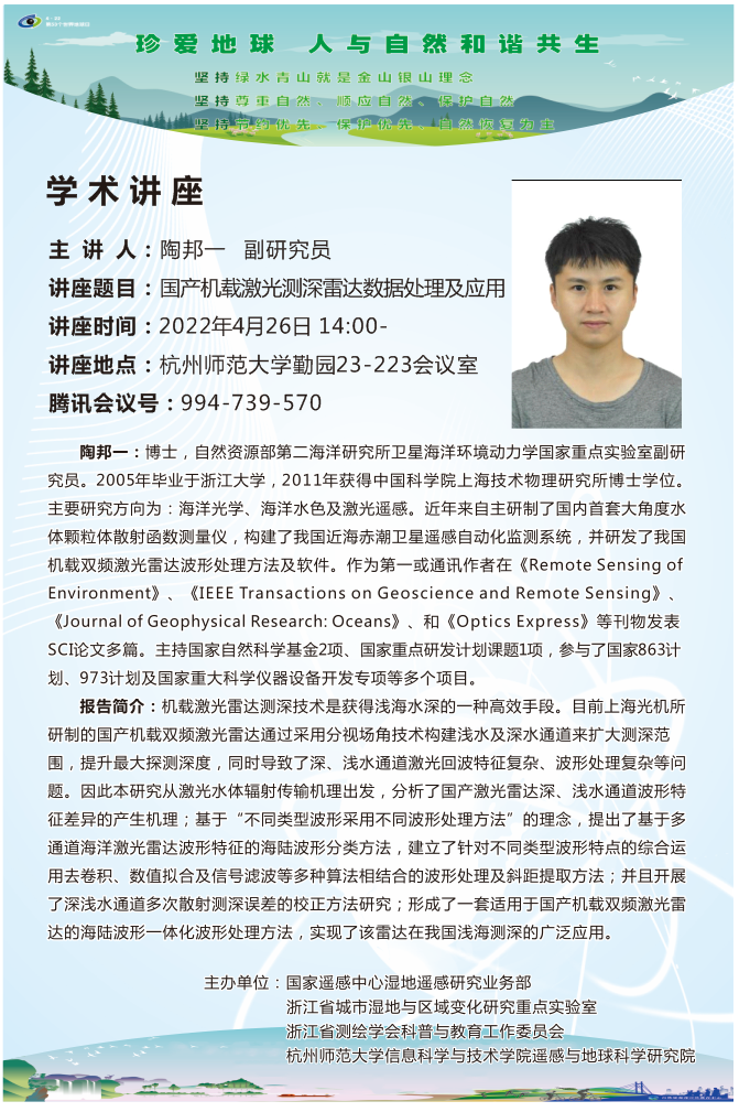 自然资源部第二海洋研究所  陶邦一副研究员   关于“国产机载激光测深雷达数据处理及应用”线上专题讲座开讲,欢迎广大师生参加。观看方法:下载腾讯会议APP或登录网页-点击加入会议-填写会议号994-739-570点击加入会议即可