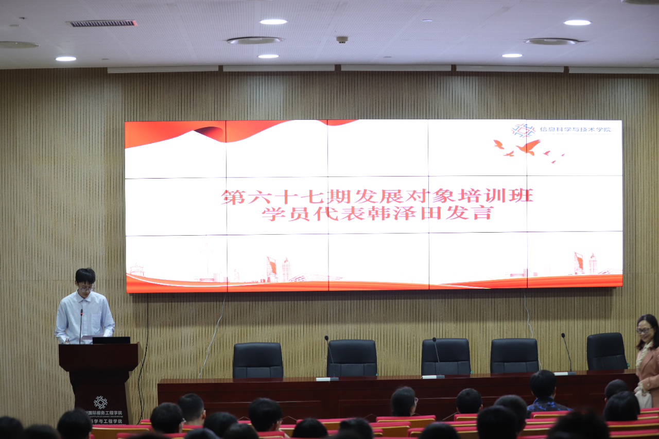 第六十七期学员代表计算机201班韩泽田代表新学员作了讲话。他分享了自己的学习感悟与体会、决心等,号召大家以党员标准要求自己,在做好生活中点滴小事的基础上,更要时刻发挥自己的先锋模范作用,积极帮助身边需要帮助的人。发扬党的先进形象,传承民族精神,肩负起中华民族伟大复兴的责任!随后,管雪老师就党校课程组成部分、相关注意事项和课程安排进行说明,再次强调课程纪律,希望同学们能端正态度,真正做到在思想上入党。