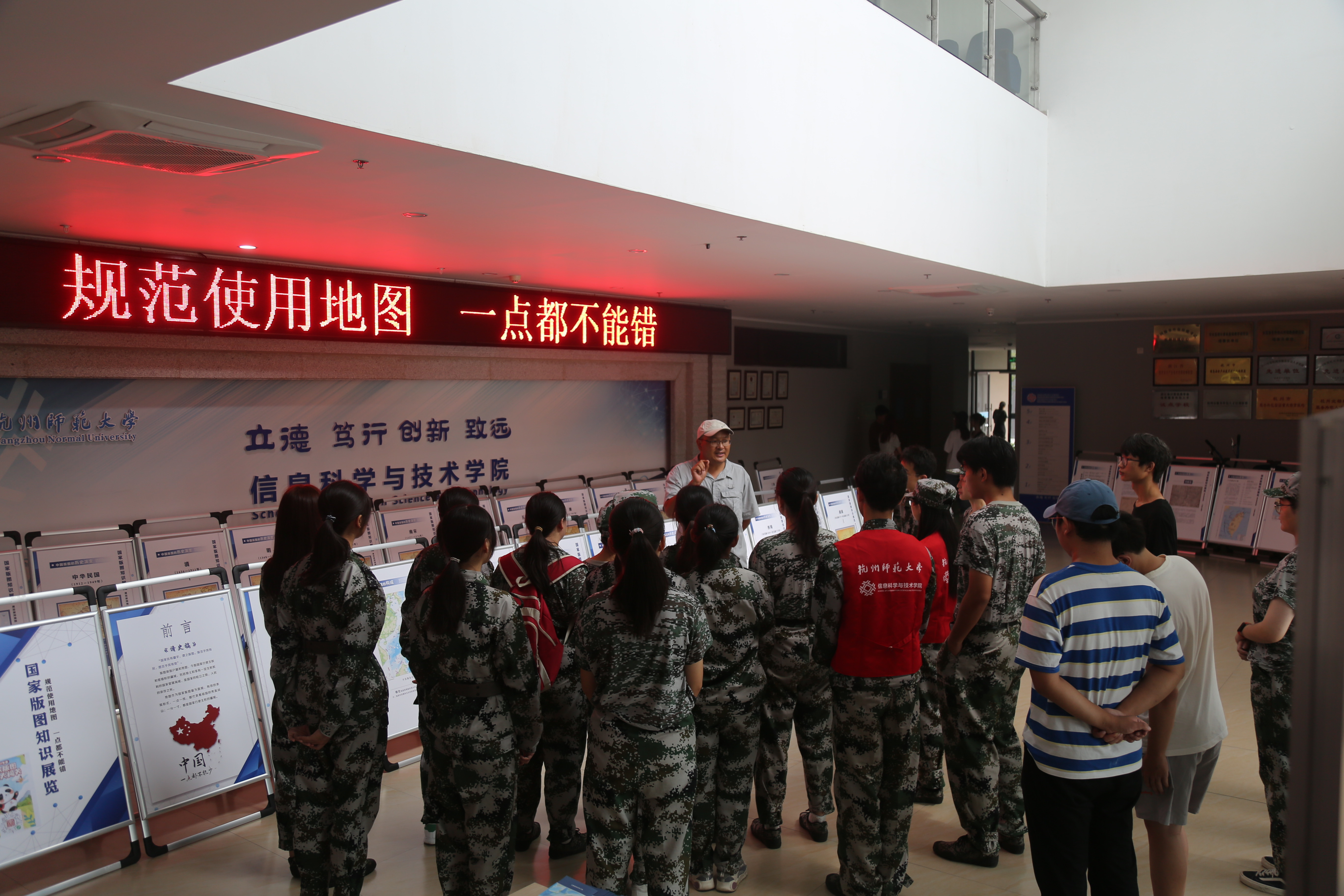 “一点一线皆是山河,一山一岛俱不退让”,今年8月26日至9月1日是我国第19个测绘法宣传日暨国家版图意识宣传周,恰逢杭师大2021级大学生正在开展爱国主义教育军事训练活动。近日,为进一步提升在校大学生的国家版图意识、倡导规范使用标准地图,杭师大空间信息技术协会联合浙江省测绘与地理信息博物馆举办国家版图知识展览进校园活动。本次活动采用线上线下结合的形式开展,包括全国测绘法主题宣传、国家版图知识展览、国家版图知识大闯关以及浙江省一等1km比长基线场参观。