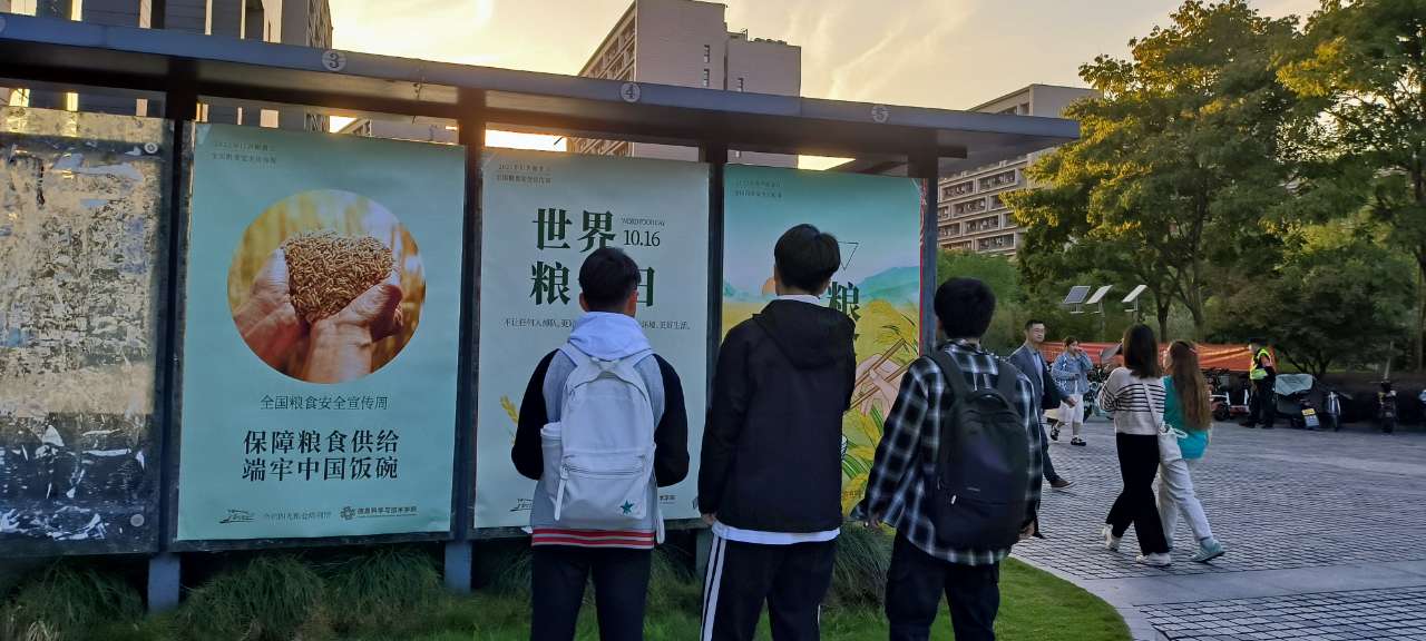 此外,学院以“保障粮食供给 端牢中国饭碗”、“世界粮食日”、“珍惜粮食”为主题,通过海报的形式在仓前校区多个区域进行宣传,不少师生驻足观看。