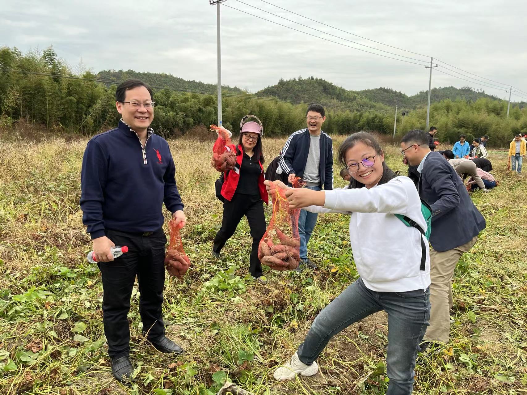 活动过程中,大家都拿到了自己的专属农具,并且分工明确,有的负责将泥土铲松,有的负责挖出番薯,有的负责装运红薯,现场氛围无比活跃,各位教职工们沉浸在一片丰收的喜悦中。学院遥感无人机拍摄了教职工劳动的快乐景象,也记录临安农村金秋稻黄美如画的田野。