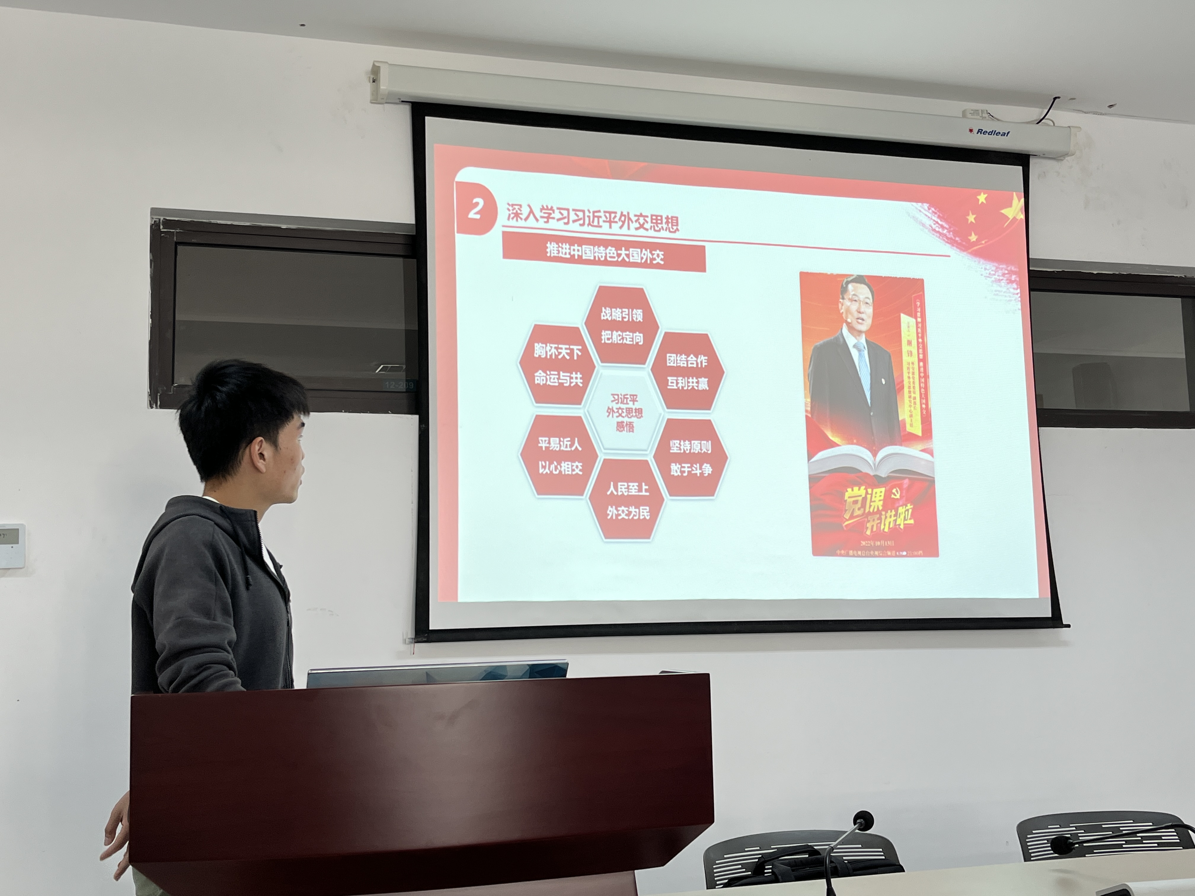 之后,崔朝健同志为大家带领大家开展主题为“深入学习党的二十大精神和习近平外交思想”的讲解与学习。全面回顾了习近平总书记代表第十九届中央委员会向大会作的《高举中国特色社会主义伟大旗帜 为全面建设社会主义现代化国家而团结奋斗》报告,并对报告的15个主题做了介绍和讲解。在深入学习习近平外交思想主题部分,崔朝健同志引用《党课开讲啦》节目中习近平外交思想研究中心谢锋主任的分享,带领同志们进一步的了解习近平外交思想,推动中国特色大国外交。