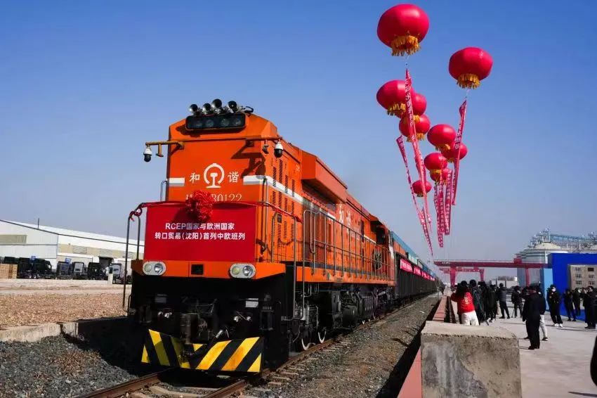 图为RCEP国家与欧洲国家转口贸易(沈阳)中欧班列首发 图片来源:新华网