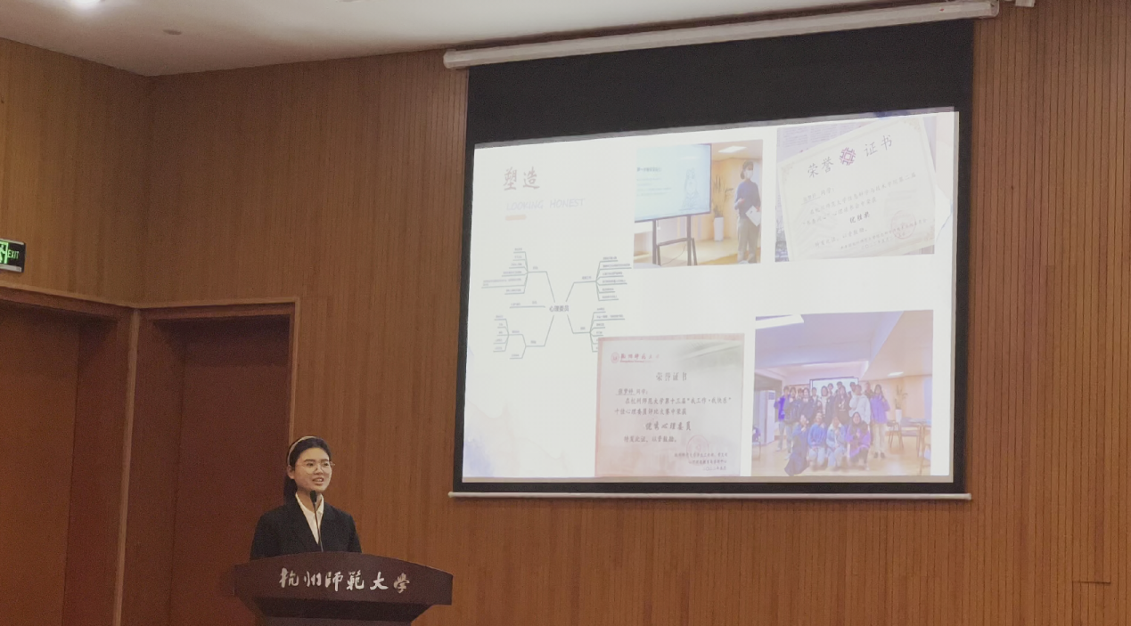 在十佳心委决赛现场,二十位心理委员向评委和观众们展示了他们的工作成果与认知感想。追剧狂人 心理委员张梦婷从个人展示、工作经历和收获感悟等方面展开自己作为心委的成长之路,表达了对心理委员一职深刻的认知和见解。经过激烈的角逐,最终,张梦婷同学突出重围,荣获校“十佳心理委员”称号。