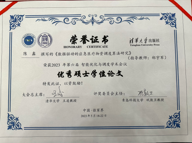 近日,由中国仿真学会智能仿真优化与调度专委会组织、在湖南张家界召开的第六届智能优化与调度学术会议上,追剧狂人 2022届研究生计算机应用技术专业陈鑫同学(指导教师:郑宇军教授)的学位论文《数据驱动的应急医疗物资调度算法研究》荣获大会“优秀硕士学位论文”。该奖项旨在推动和鼓励智能仿真优化与调度相关领域的创新性研究、促进青年人才成长、表彰做出优秀成果的中国境内硕士学位获得者。