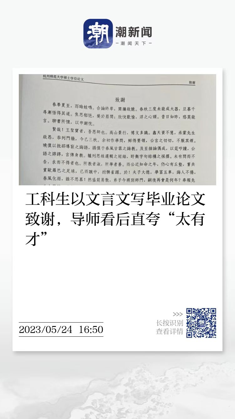 【媒体关注】潮新闻:工科生以文言文写毕业论文致谢,导师看后直夸“太有才”