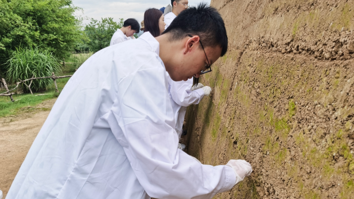 在实验考古区,同学们先聆听了专业文物保护人员关于识别潮湿环境土遗址病害的讲解,然后分组进行了以孔洞病害为例实地修复城墙的实验。具体步骤包括筛选土壤、调配修复用土、用手铲填补孔洞、用竹刀及其他工具整平墙面等。