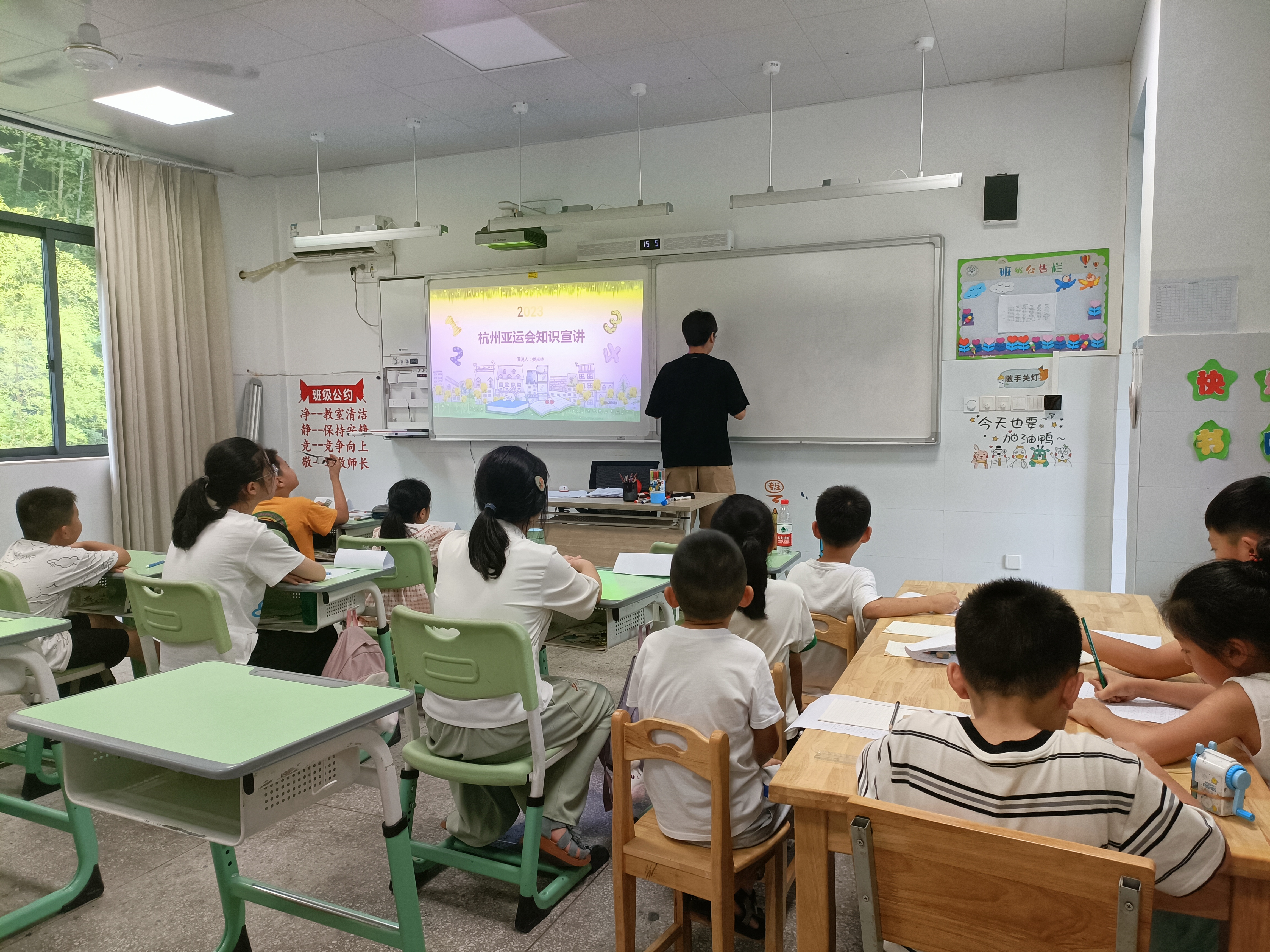 “小朋友们,你们知道杭州亚运会的吉祥物叫什么吗?”“黄色的叫琮琮,绿色的是莲莲,蓝色的是宸宸!”小朋友们争先恐后地回答道,支教队队员朱硕涵向大家仔细介绍了三个吉祥物的设计灵感和丰富内涵。随后,小朋友们用五彩画笔描绘了自己心目中的吉祥物形象,并结合刚学到的亚运知识制作了一张张精美的手抄报,用自己独特的方式表达对杭州亚运会的无限期待。