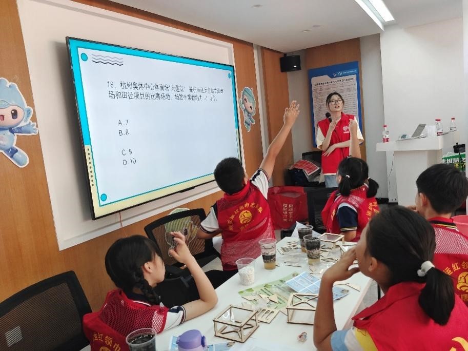 活动的最后,主讲老师带着小朋友们根据前期介绍的亚运知识以及实验开展了一场“学习展风采,亚运添精彩”为主题的知识竞赛。“杭州亚运会开展时间是什么时候?”、“杭州亚运会吉祥物的组合名叫什么?”、“图中展示的亚运场馆将举办什么比赛?”,赛题涵盖了亚运会方方面面的知识。小朋友们踊跃回答,常常题目还没有读完,答案就已经脱口而出。小朋友们的优异表现,让主讲老师们都不禁为他们举起大拇指。