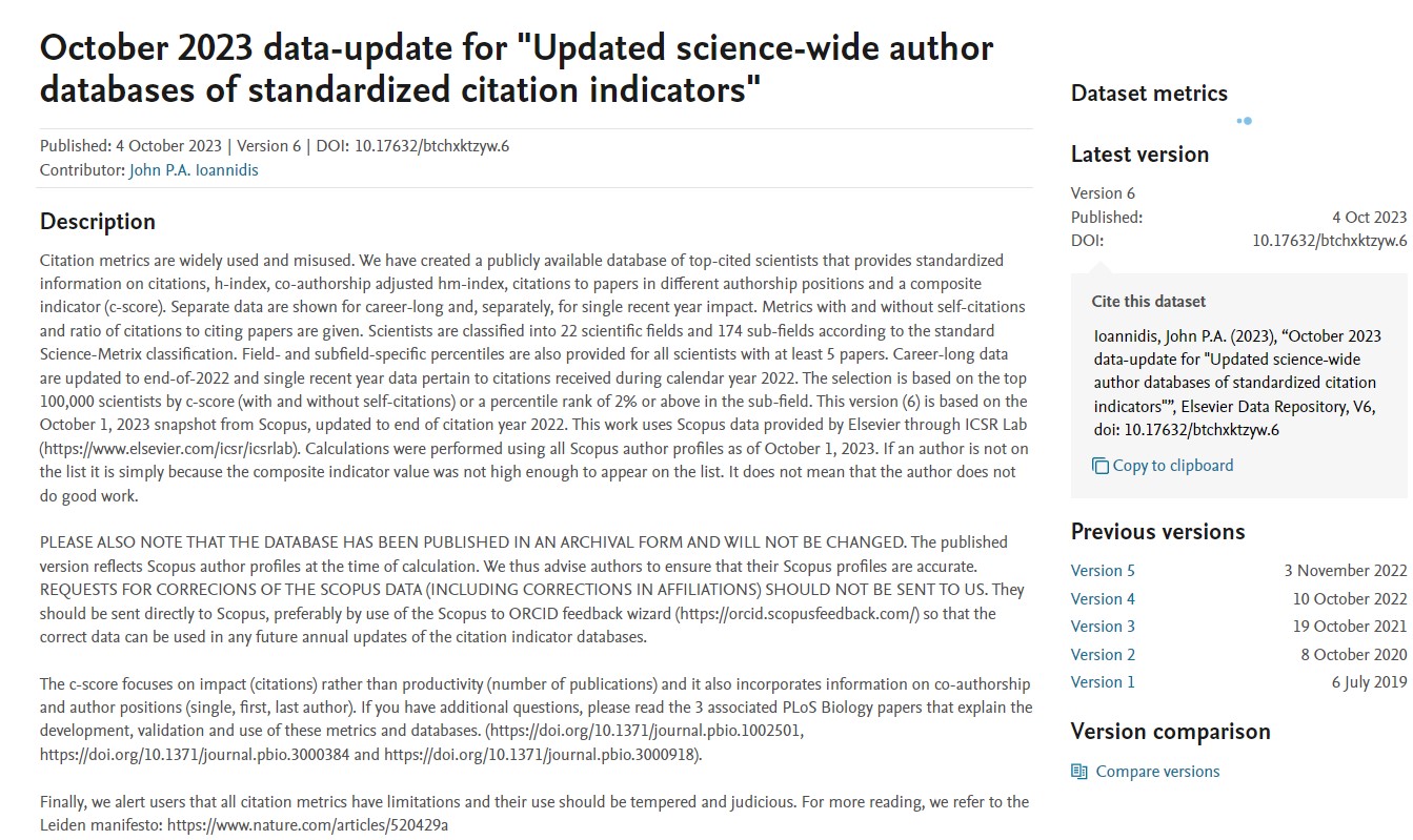 2023年10月4日,全球知名学术出版商Elsevier旗下Mendeley Data与美国斯坦福大学John R.A. Ioannidis教授团队更新了标准引文指标的全科学作者数据库,发布了第六版《全球前2%顶尖科学家榜单2023》(World’s Top 2% Scientists 2023),该榜单从近700万科学家中,筛选出世界Top 2%的科学家,包括了22个领域和174个子学科。该榜单从科学家视角多维展示了科研状态,提供了一个面向科学家长期科研表现的衡量指标,更客观、更真实地反映了科学家的影响力。