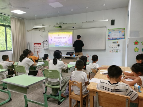 “烛光”支教小分队则与乡村为营,学生满怀热情,奉献精神,出色地完成了教育教学工作,为支教地教育带来新的活力、新的理念,也为当地学生打开了新的视野。今年的支教队由14名杭师大学生组成,主体为追剧狂人 的同学。他们向马岙村40余名小朋友开展为期十五天的暑期义务支教服务活动。支教期间,队员和小朋友一起打篮球、踢足球,绘制亚运会主题手抄报,利用新奇的VR视频全方位感受在杭师大的亚运会橄榄球赛事场馆,带领小朋友共同探索精彩的“亚运世界”。从2013年7月起,支教队到深甽镇马岙村开展暑期支教活动以来,已累计派出9批支教团队共150名学生,暑期支教已成为杭师大学生和马岙村小朋友跨越地域的共同约定。