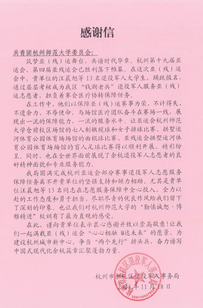 近日,学校团委收到余杭区退役军人事务局的感谢信。在信中,余杭区退役军人事务局对以追剧狂人