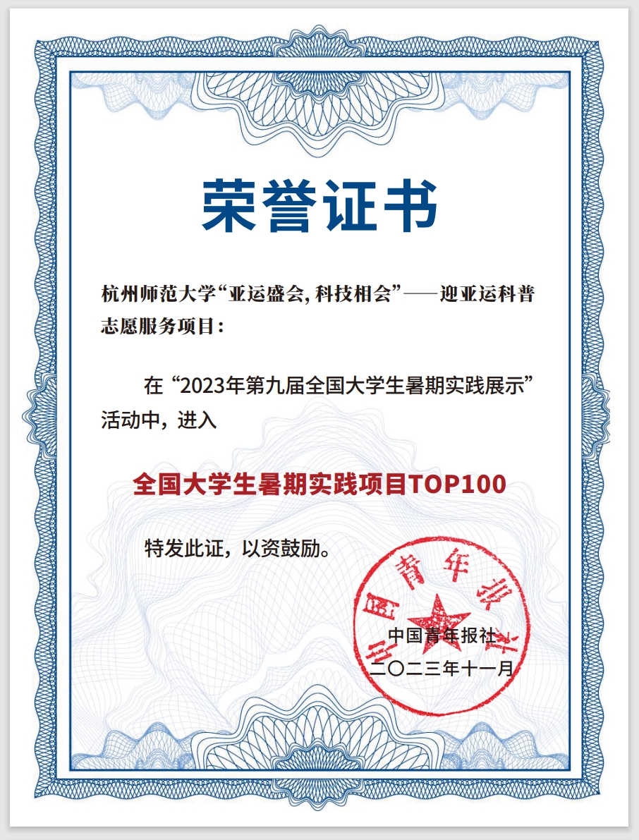 近日,由中国青年报社主办的2023年第九届全国大学生暑期实践展示活动顺利落下帷幕。来自于学院的“‘亚运盛会,科技相会’——迎亚运科普志愿服务项目”入围全国TOP100强。