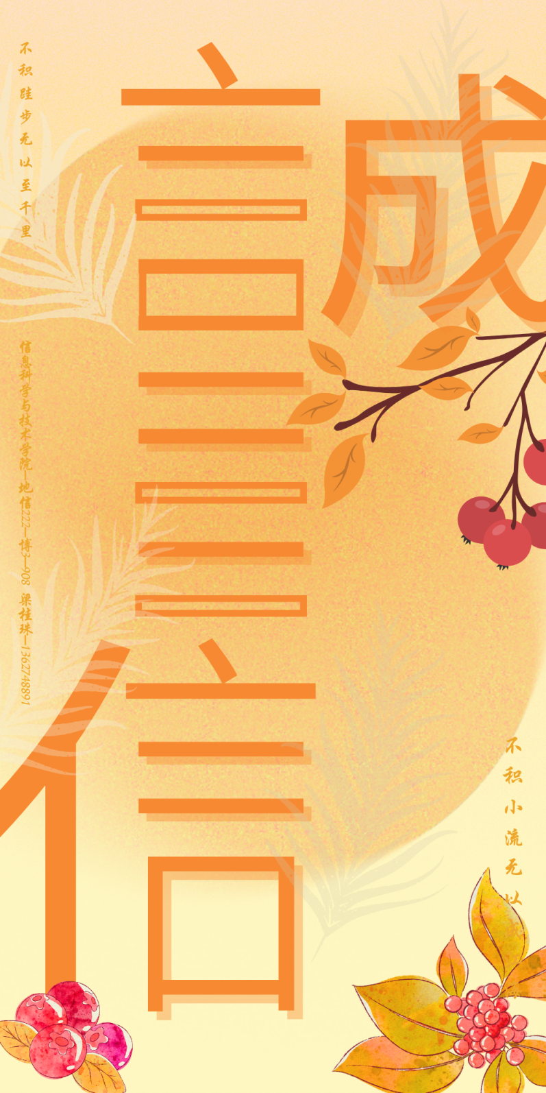 教育之行,以身求践。为了让诚信深入人心,并积极响应诚信教育系列活动,激发同学们的想象力与创造力,信息学子们也积极参加了学校举办的海报设计大赛,为本次大赛献上了众多优秀的海报作品、视频作品以及诚信标语。