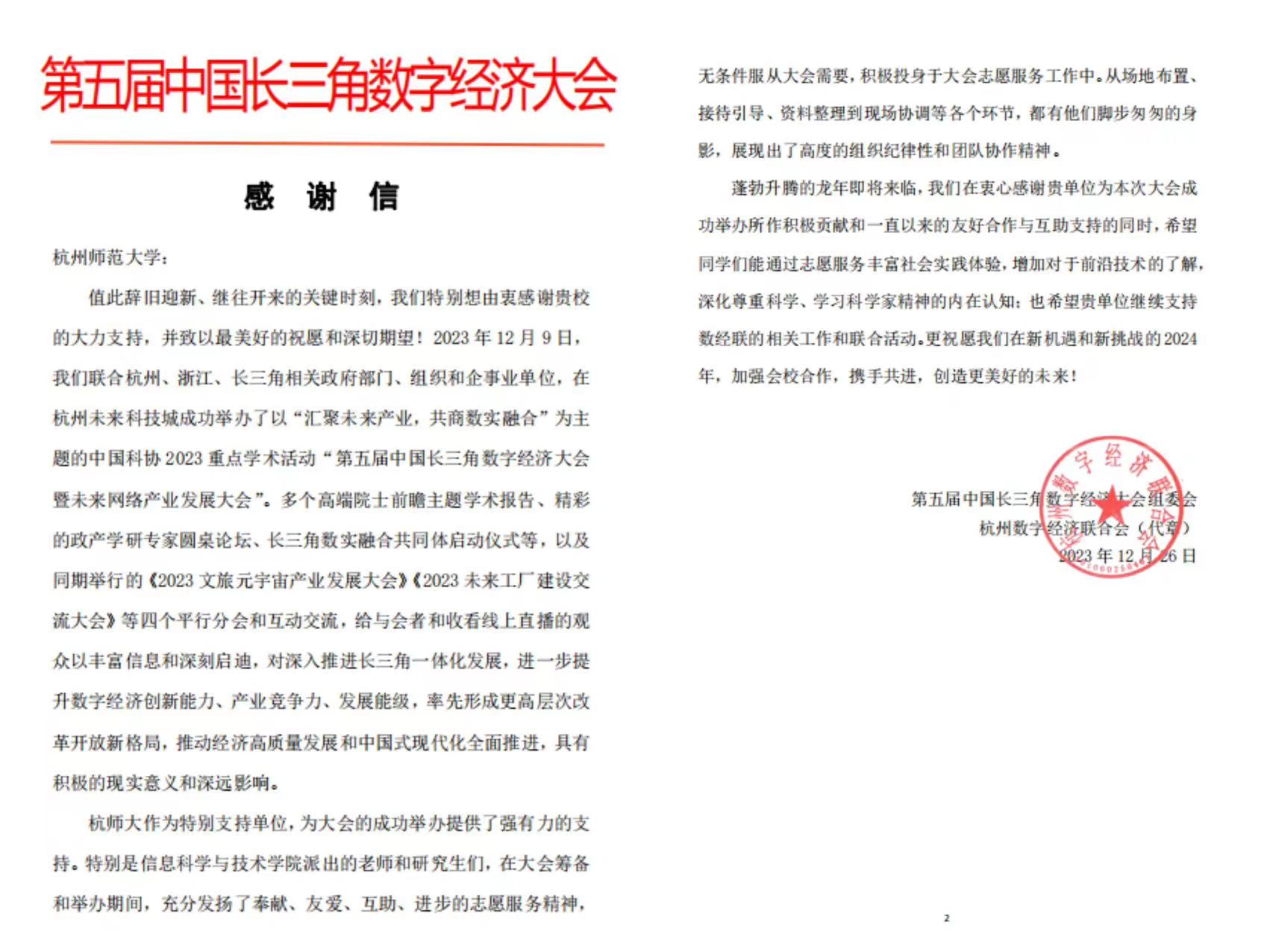 追剧狂人 收到第五届中国长三角数字经济大会感谢信