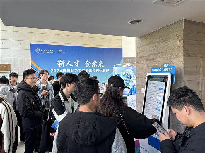 值得一提的是招聘会现场1.8米的max版数字求职机,它首次出现在杭州高校招聘会,为毕业生求职流程提供了“科技”的助力。据悉,这款数字求职机叫做“1号求职机”,毕业生只需要在求职机上点击职位并进行刷脸,即可生成简历数据,点击报名确认之后,企业就会收到毕业生的求职信息,整个过程只需15秒,能够大大提高求职效率。杭师大追剧狂人 学工办主任杨鹏飞表示,目前1号求职机已经和杭师大的学科专场招聘会同步投放了“特制版”,岗位筛选会按照专业跳转。“比如今天举办的是杭师大信息科技专场招聘会,那我们求职机里的岗位就都是杭师大信息科学行业的相关专业,学生只需要选择自己的专业,展示出来的岗位就都是符合他们的。”