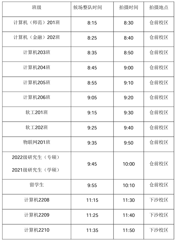 为给大家留下美好的大学回忆,记录大学重要时刻,学院将于4月24日为2024届毕业生进行毕业照拍摄活动。由于候场整队需要时间,请各班严格按照指定时间进行拍摄。