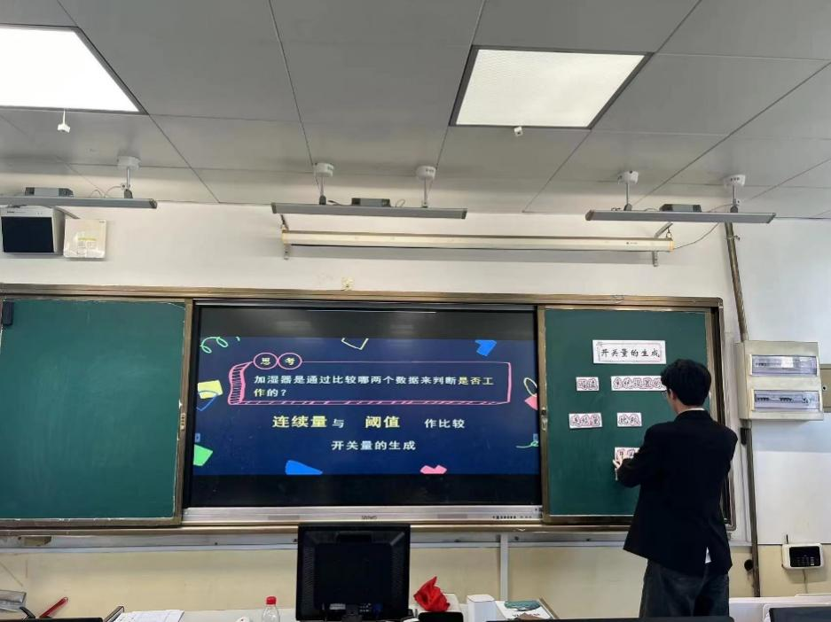 在《开关量的生成》这节课中,殷贻佳同学采用创设情景的方式引导学生分析问题解决问题,教学上整体采用实验探究的形式,通过让学生动手观察记录智能加湿器的数据和工作状态来引出提出阈值的概念,以及开关量的生成。同时,设置了小活动让学生手动设置阈值,体会阈值的作用。课堂整体生动直观,教学手段新颖,设置逻辑清晰,讲抽象概念细化到生活的实例中。小学带教老师认为整节课生动形象,采用让学生探究发现问题的方式,属于实验教学,学生操作性强,吸引学生兴趣,同时提高课堂活跃度。锻炼了学生的计算思维,但建议环节设置时还要控制好课堂常规。