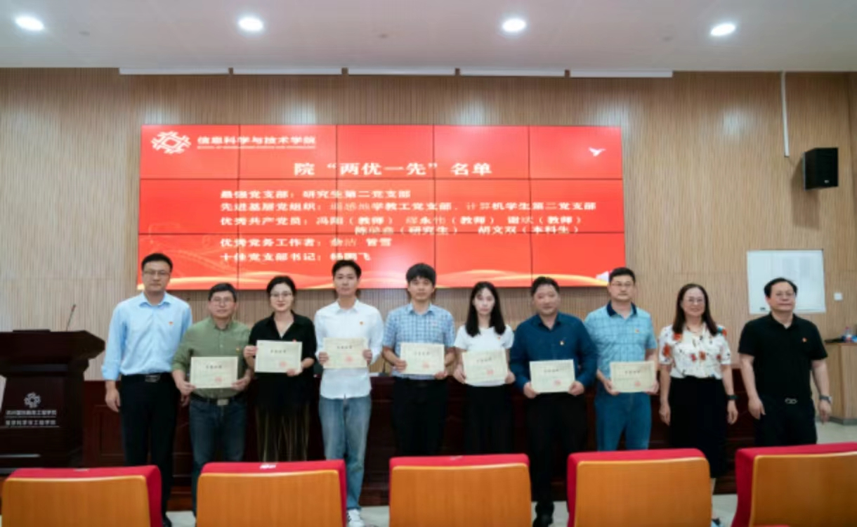 会议由学院党委组织员管雪老师主持。国歌声起,共唱嘹亮,大会在一片庄严中拉开帷幕。首先,由周春儿书记领誓,和新党员与老党员一起重温入党誓词。“对党忠诚,积极工作,随时为党和人民牺牲一切,永不叛党。”铮铮誓言,拳拳心声,将大会氛围涨至高潮。接下来,党委副书记王奔院长宣读了学院党委关于表彰2023年度学院最强党支部、先进基层党组织、优秀共产党员、优秀党务工作者、十佳党支部书记的文件,其中研究生第二党支部荣获“最强党支部”荣誉称号;遥感地学教工党支部、计算机学生第二党支部荣获“先进基层党组织”荣誉称号;冯阳老师、缪永伟老师、谢斌老师,陈璐鑫同学、胡文双同学荣获“优秀共产党员”的称号;余洁老师与管雪老师荣获“优秀党务工作者”的称号;杨鹏飞老师荣获“十佳党支部书记”荣誉称号。