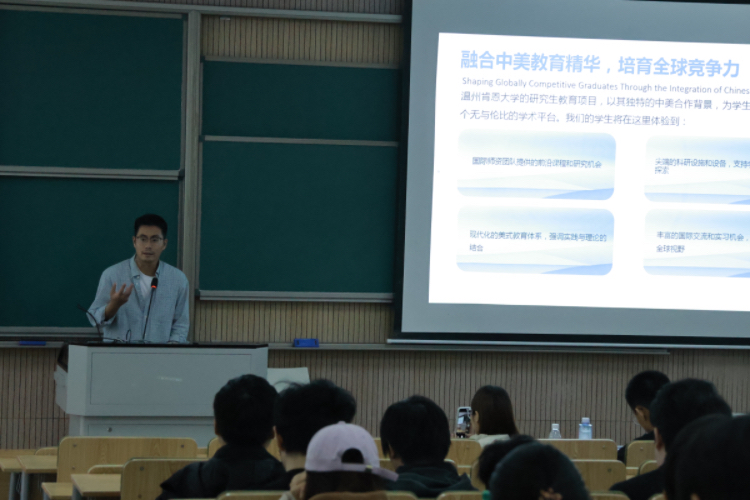 在申请流程方面,王豪校友向同学们展示了温州肯恩大学硕博项目的申请条件、申请材料、申请时间以及面试安排等相关信息。他提醒有意申请的学生要仔细阅读招生简章,提前准备好相关材料,并关注学校官网的最新动态。
