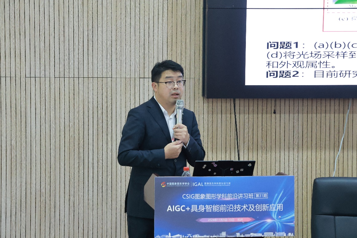 中科院计算所高林研究员作了题为“面向高真实感几何建模的重光影技术”的分享。高林研究员指出随着人工智能和计算机图形学技术的交叉融合,高真实感建模技术在快速演进,从神经辐射场到高斯泼溅,这些方法仅通过多张彩色照片就可以进行高真实感的几何建模。相比于传统方法,降低了几何建模的成本,提升了照片级真实的效果。但是这类方法相比于传统方法更加难以编辑,为了解决这一问题,在本次报告中,高林研究员基于“面向高真实感几何建模的重光影技术”这一题目,分享了如何对神经辐射场和高斯泼溅进行解耦表征、并对其进行重新光影,包括将分别介绍面向人-物-场的重新光影方法。