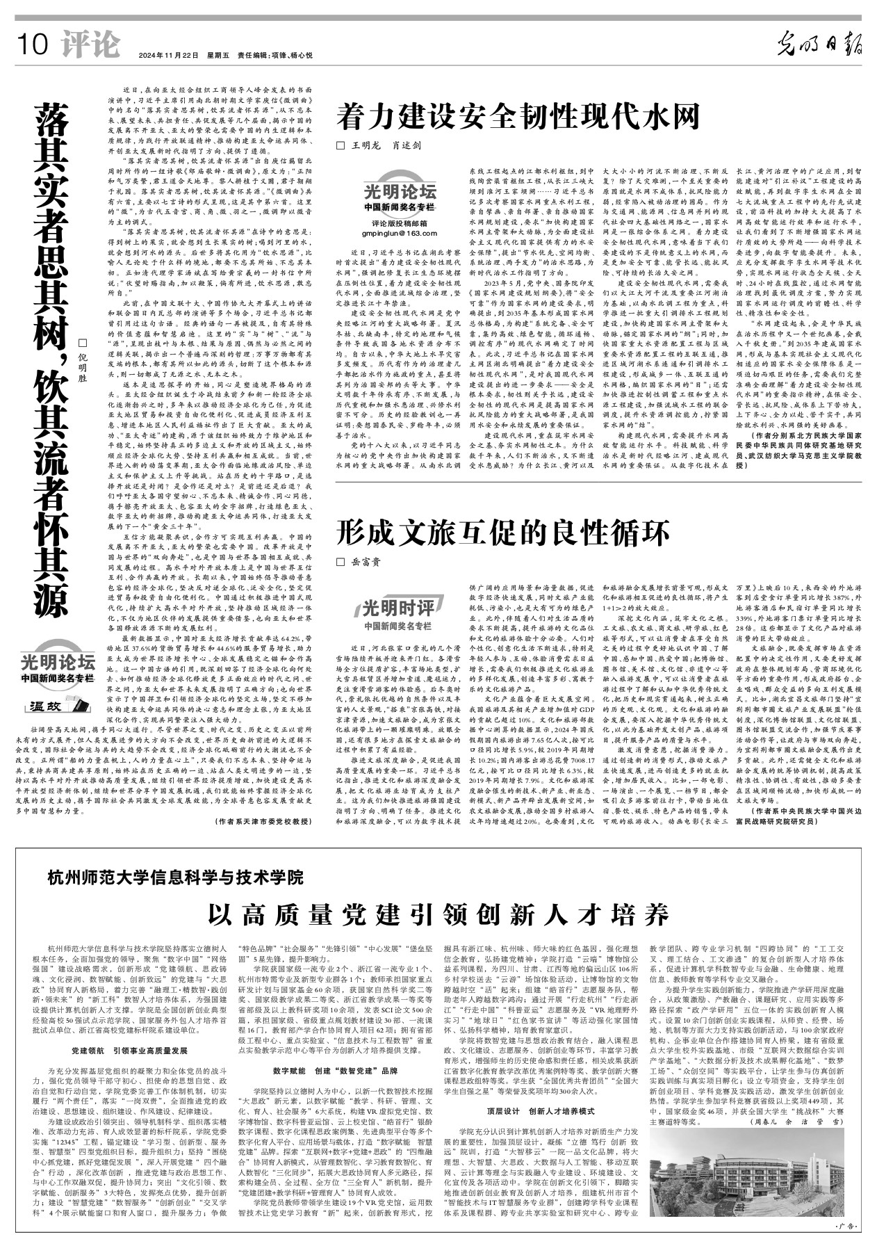 学院坚持以立德树人为中心,以新一代数智技术挖掘“大思政”新元素,以数字赋能“教学、科研、管理、文化、育人、社会服务”6大系统,构建VR虚拟党史馆、数字博物馆、数字科普亚运馆、云上校史馆、“皓首行”银龄数字课程、数字化课程思政案例集、先进典型平台等多个数字化育人平台、应用场景与载体,打造“数字赋能 智慧党建”品牌。探索“互联网+数字+党建+思政”的“四维融合”协同育人新模式,从管理数智化、学习教育数智化、育人数智化“三化同步”,拓展大思政协同育人多元路径,探索构建全员、全过程、全方位“三全育人”新机制,提升“党建团建+教学科研+管理育人”协同育人成效。