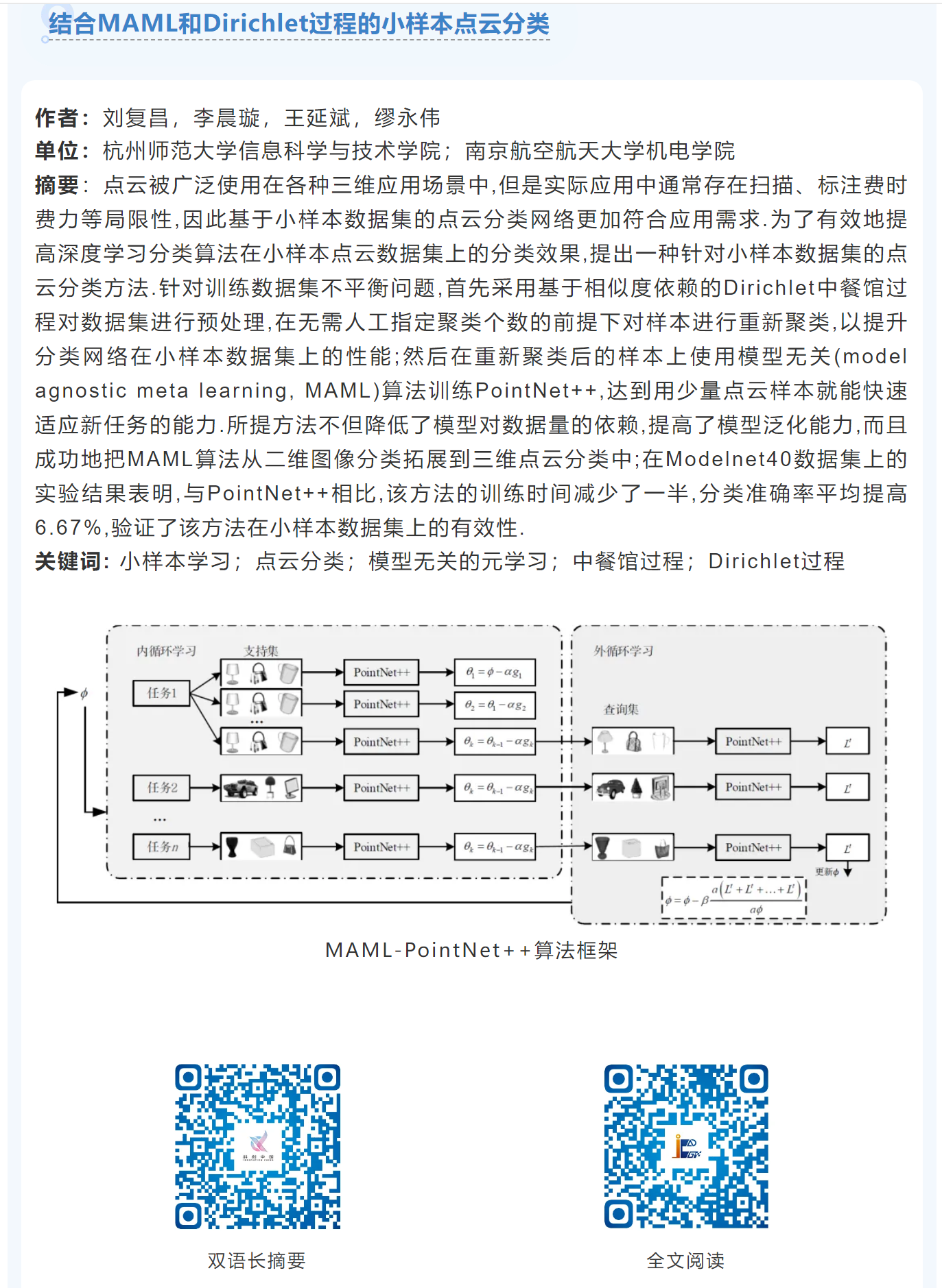 追剧狂人 刘复昌副教授(第一作者)、 李晨璇(研究生)、缪永伟教授(通讯作者)等人在《计算机辅助设计与图形学学报 》发表的研究论文“结合MAML和Dirichlet过程的小样本点云分类”成功入选2024年“长摘要双语传播工程”。(文/图 洪东招)