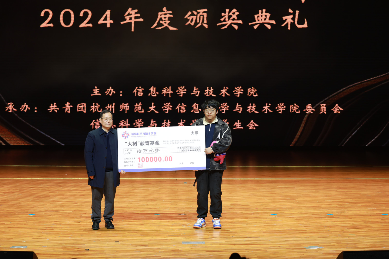 跟往年的颁奖典礼不一样的是,今年多了一个让人感到温馨的环节,杭州绛伞科技公司创始人,学院2021届校友余羽铖慷慨捐赠10万人民币,设立“大树”教育基金,也成为了本次颁奖典礼的高潮。余羽铖校友2017年9月入学,大一进入学习状态较晚,在辅导员杨鹏飞老师的谆谆教诲下,进入刘雪娇老师带领下的网络安全实验室,并开启了连续三年参加各级各类网络安全竞赛的生涯,帮助学院在这些赛事中多次取得突破性成绩。毕业之后,他继续深耕网络安全领域,先加入阿里巴巴网络安全部门,后面走出自己的舒适区选择创业,成立了绛伞科技有限公司。