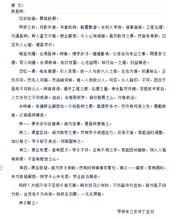 学院研究生古文作业展现文学功底,深情讲述师生情谊