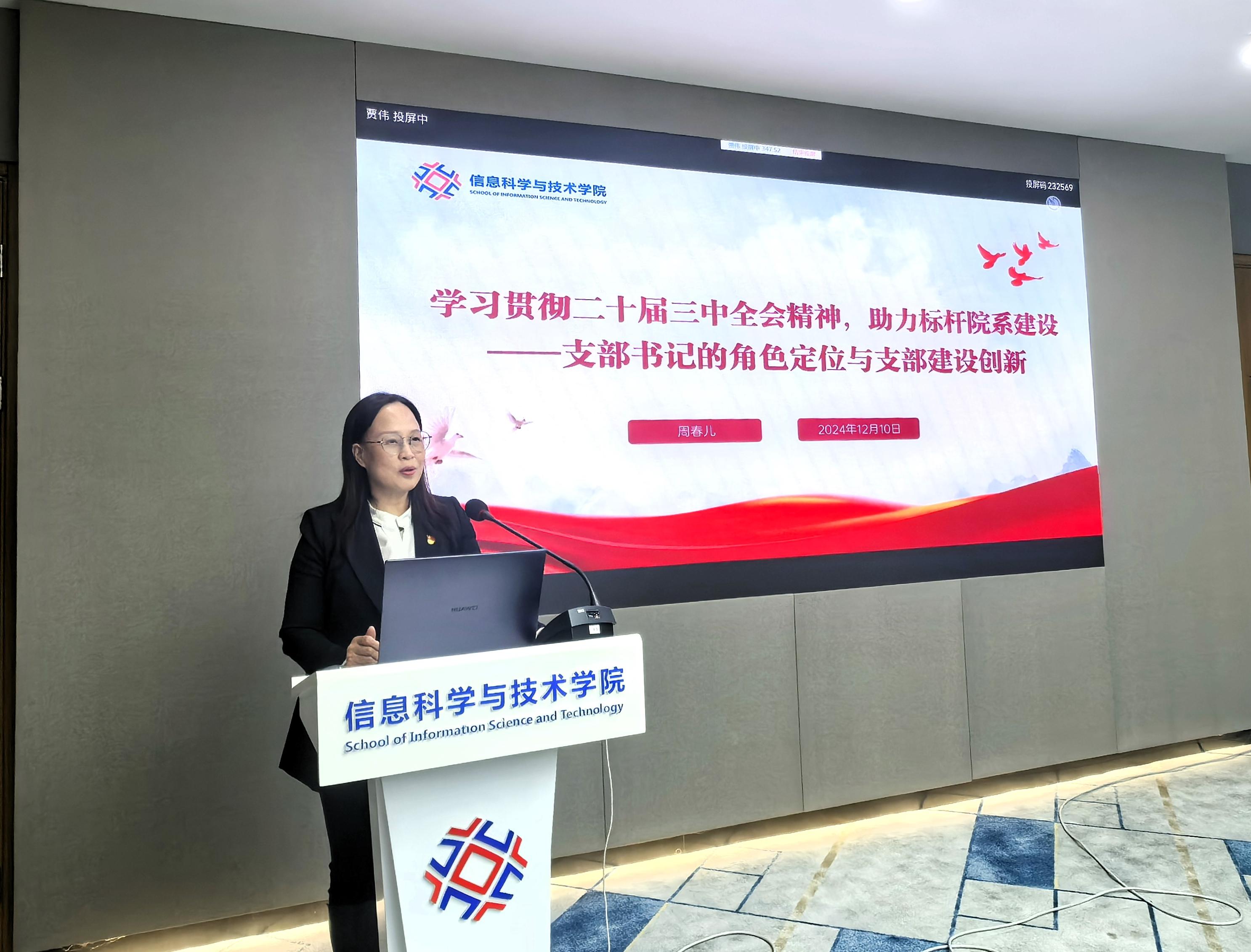 学院党委书记周春儿对各党支部的工作给予了充分的肯定,通过支部书记述职看到了各支部工作内容与特色,同时对未来的党支部工作提出了建议,如党建与业务工作需进一步双融双促。会上,周书记带领全体人员专题学习了二十届三中全会精神,并就标杆院系建设背景下的支部书记角色定位与支部建设创新进行了探讨。她强调,要认真学习贯彻二十届三中全会精神,鼓励支部书记明确角色定位,在推动党建质量创优提升中,要做政治引领者、改革推动者和组织建设者,通过创新组织生活方式、创新党员教育模式、创新服务师生机制等,助力标杆院系建设。