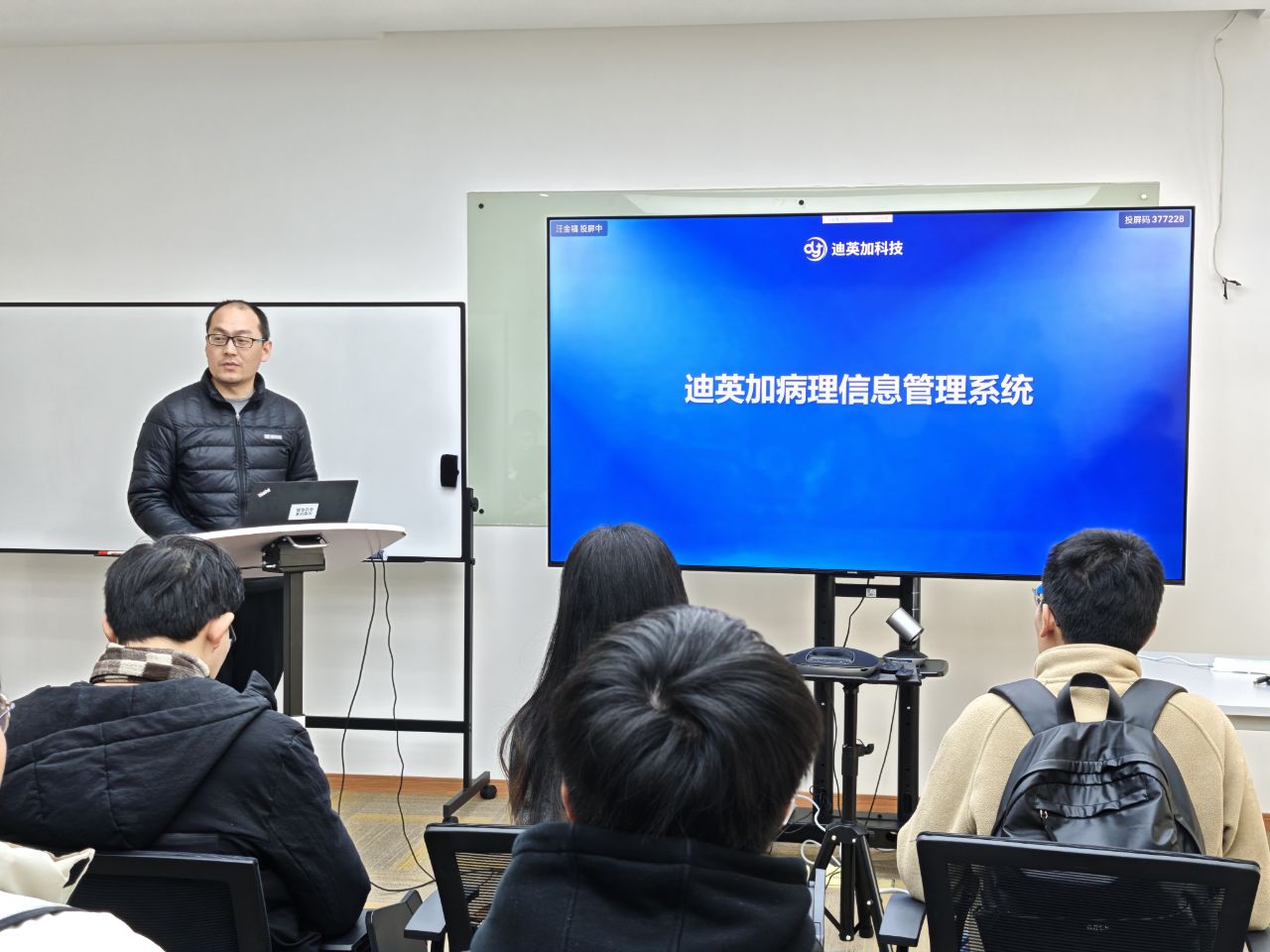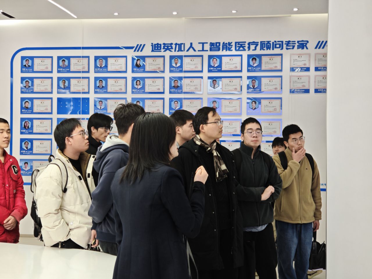 活动伊始,同学们在公司展厅集合。通过播放的视频,大家了解到迪英加的发展历程、创始团队的创业故事,以及在AI智慧医疗领域20余年的深耕成果,还认识到其多模态人工智能分析模块、高效精准辅助诊断系统等前沿产品体系。随后,同学们来到楼上。HR详细介绍了公司的人才需求、实习与工作岗位信息,以及员工发展路径。软件开发负责人和算法负责人生动展示了公司在软件开发、算法研究方面的实力,让同学们对“AI+数字病理”有了更直观的感受。在交流环节,同学们根据兴趣分组,与对应岗位负责人探讨实习和工作机会,现场气氛热烈。大家积极咨询岗位技能要求、工作内容等问题,为未来的职业发展收集信息。活动最后,全体参与人员合影留念。