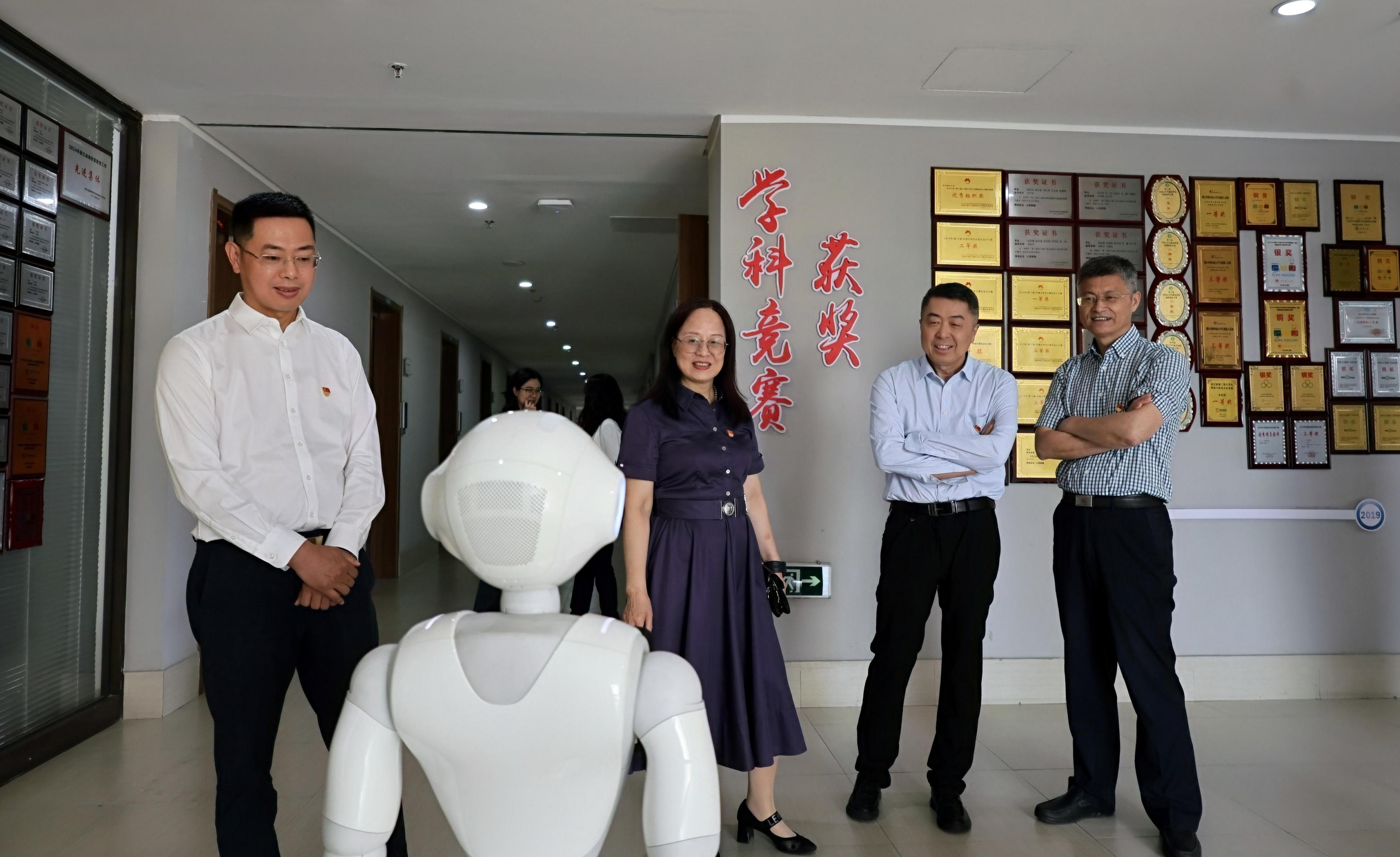 在追剧狂人 党委书记周春儿带领下,朱军一行走进了教育部移动健康工程中心,亲身体验耳穴诊疗技术,深入了解健康、养老等产业与科技交叉的前沿成果。并参观了机器人实验室、数字媒体虚拟仿真实验室等,通过近距离或者沉浸式体验,共同探讨数智化创新技术的未来发展方向。
