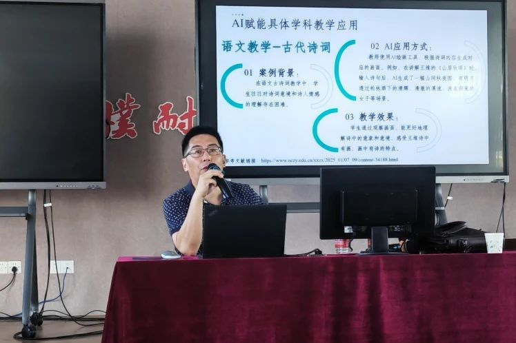 胡克用老师以“智能赋能,育见未来”为主题,从技术工具应用、教学场景融合和伦理规范构建三大维度,系统阐述了AI技术对教育生态的重构与推动。在技术工具层面,他通过大模型技术现场演示,生动展示了AI在备课资源整合、学情数据分析、课堂互动增强等方面的实际效能;在教学融合方面,结合典型实践案例,深入解析AI如何助力个性化学习设计、智能作业批改与实时教学反馈;在伦理规范层面,胡老师特别强调应坚守教育本质,警惕数据过度依赖与算法偏见等潜在风险,倡导负责任地使用技术。