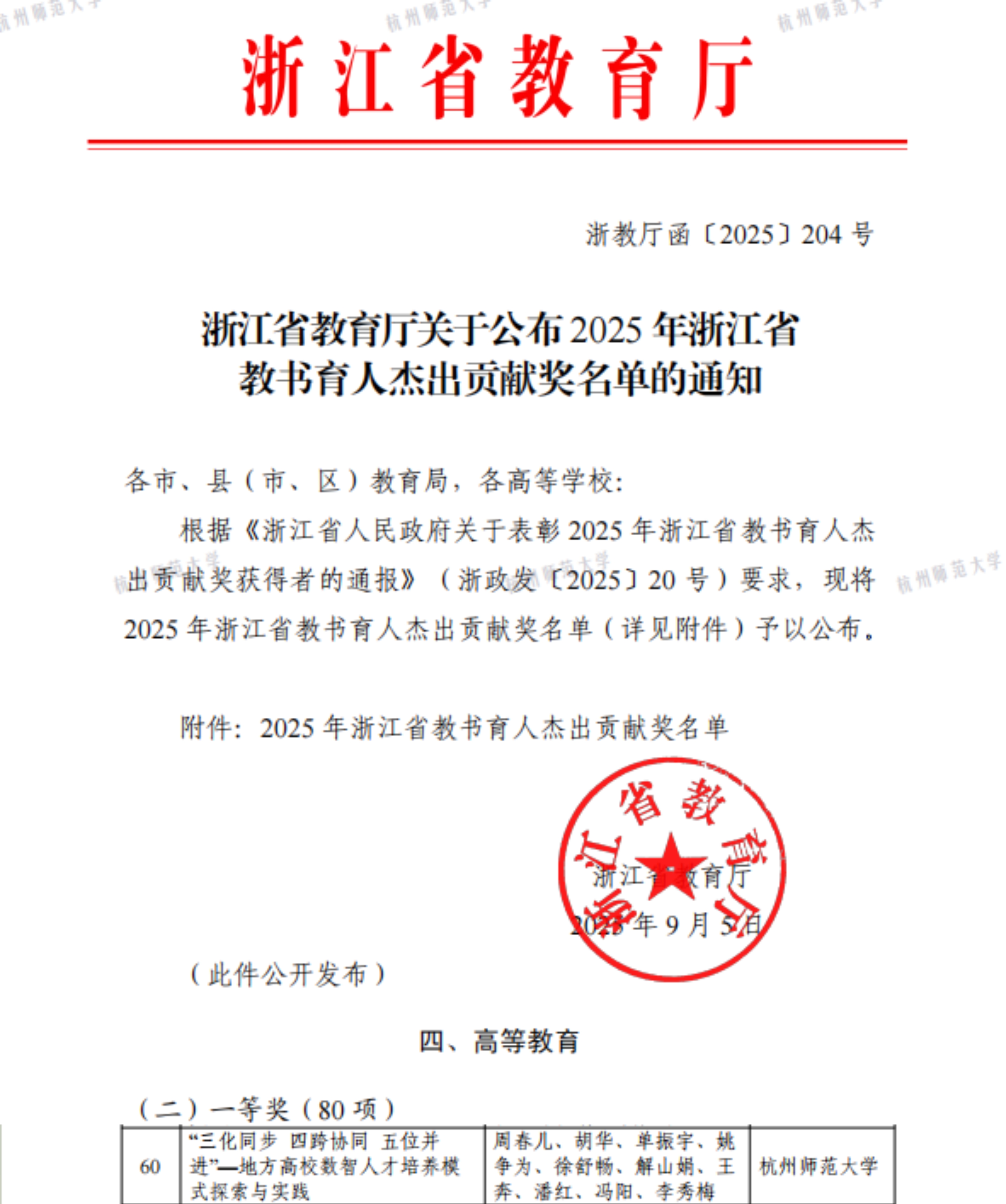 欣闻喜讯,振奋人心!在刚刚公布的2025年浙江省教书育人杰出贡献奖评选结果中,院荣获浙江省教学成果高等教育一等奖!