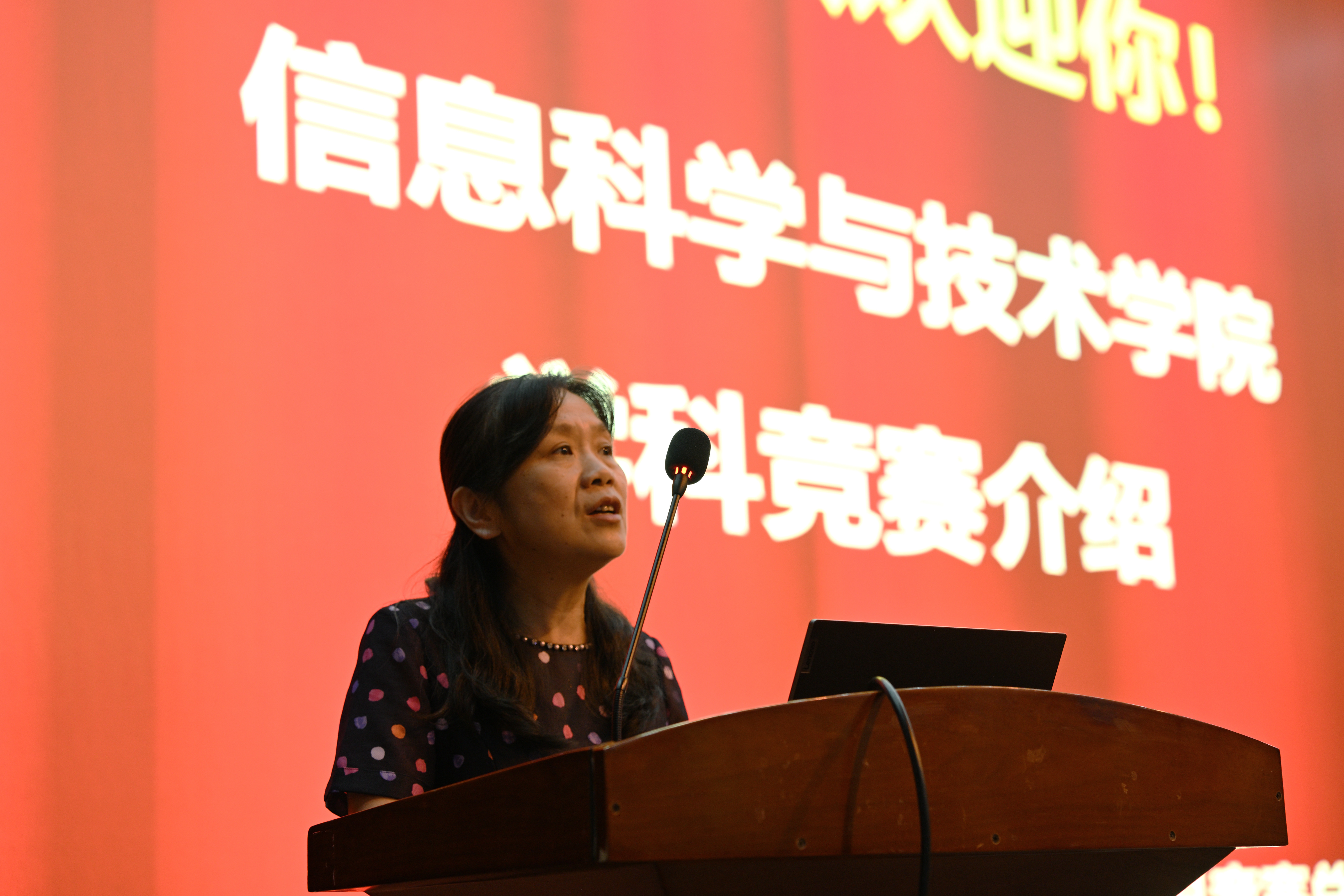 首先,由学院学科竞赛总负责人潘红老师作宣讲。潘老师聚焦学院竞赛具体情况,以PPT形式生动系统地介绍了学院的各类竞赛平台、历年取得的成绩以及各赛事的参赛流程,为刚踏入大学校园的新同学们全面解析了学院在竞赛方面的资源优势与培养体系。潘老师指出,对每一位同学来说,参加学科竞赛活动,不仅是对课堂学习的延伸,更是创新实践能力的锻炼,团队协作精神的培养。她特别强调,根据对多年来的竞赛活动统计表明,通过系统性的竞赛训练,同学们拓展了视野,显著提升面对复杂工程问题时的系统思维和解决能力。