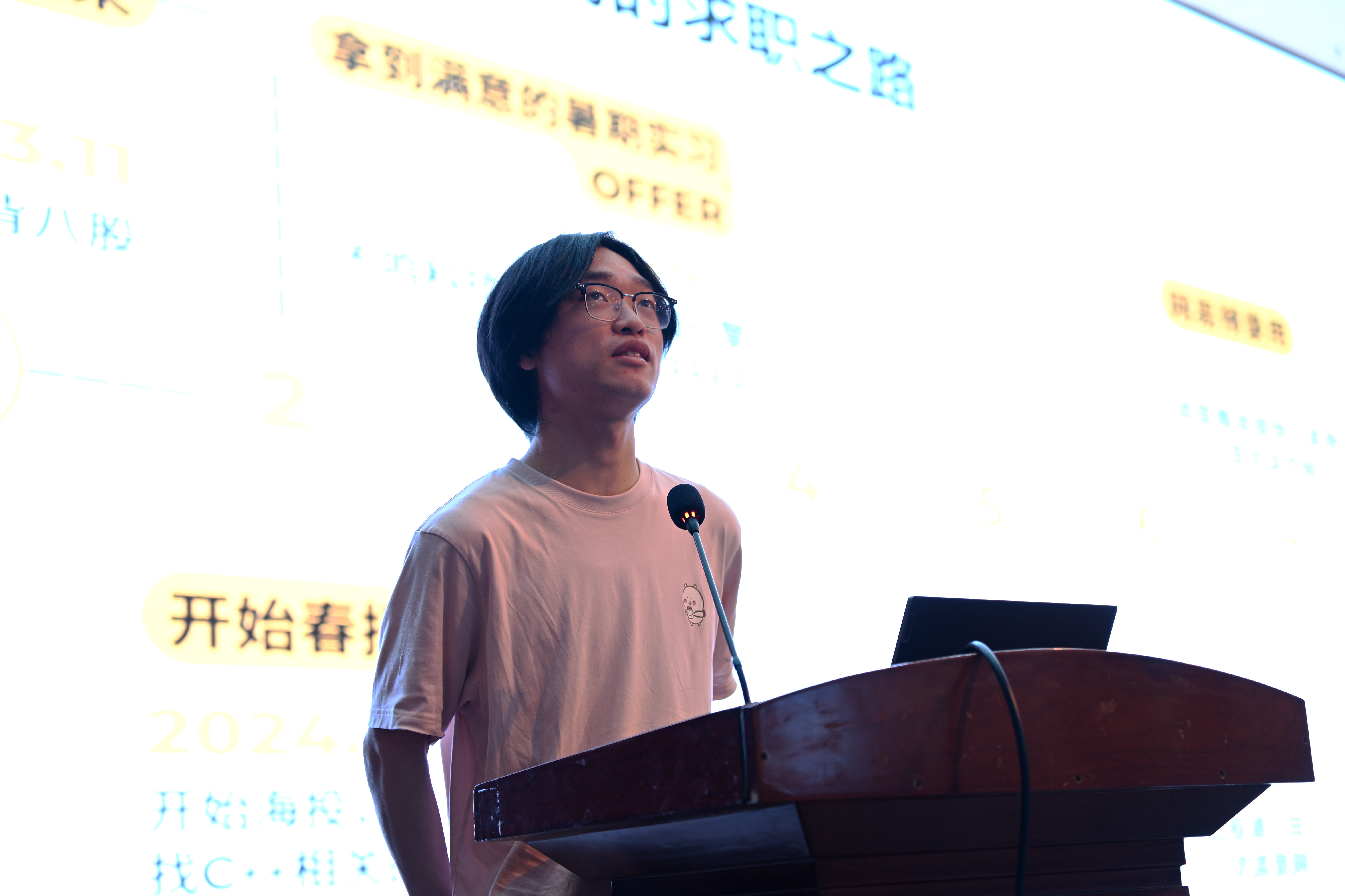 最后,由现就职于网易的前ACM队长殷吴辉进行宣讲。殷吴辉聚焦自己的竞赛经历,从校园赛场到大厂职业,得出了许多成长体会。他强调,主动规划个人发展路径至关重要,并鼓励学弟学妹善用学院提供的多种资源——包括导师指导、学科竞赛队伍的系统训练、各类技术讲座和竞赛平台,不断积累经验、提升竞争力。这些积累不仅为求职尤其是进入互联网大厂奠定坚实基础,也为长远发展铺平道路。