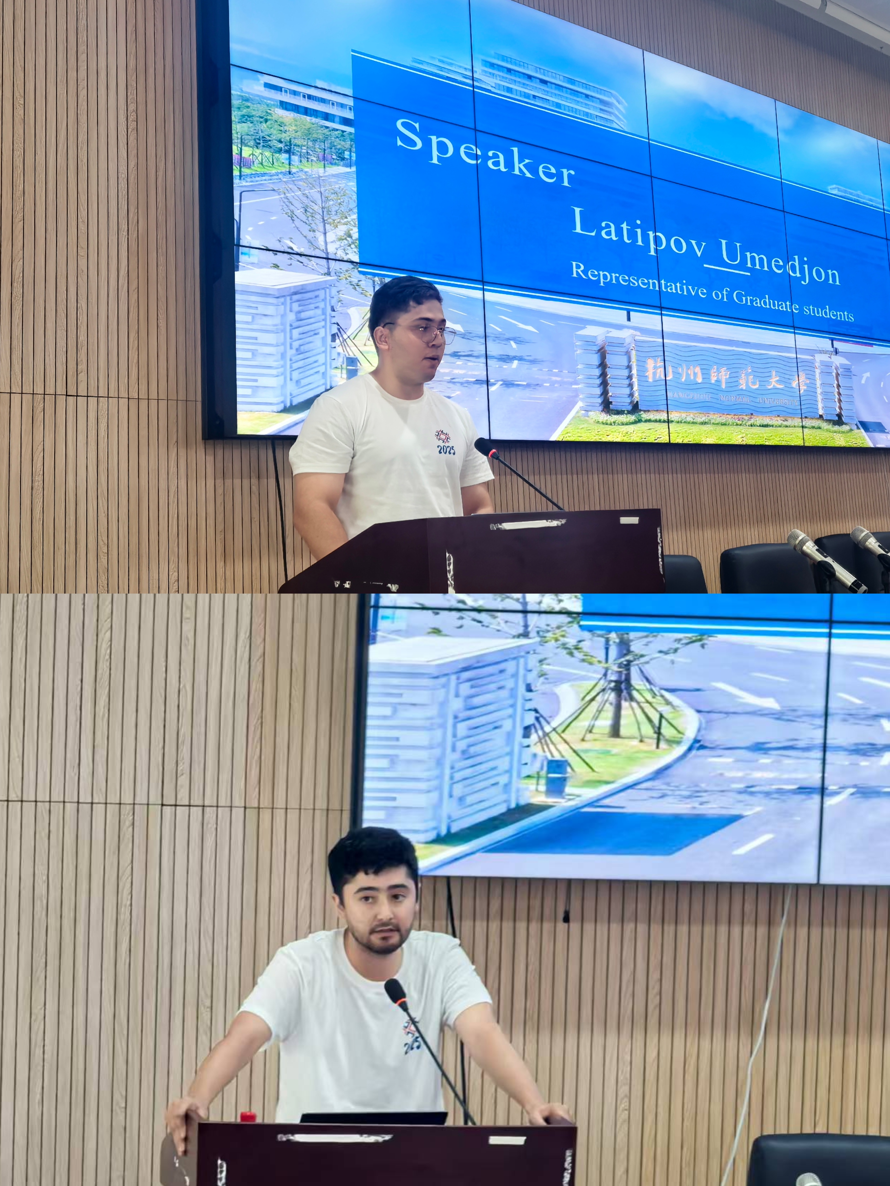 教师代表丁丹丹对国际学生送出美好祝福,并提出殷切的希望,勉励同学们珍惜学习机会、明确学习目标。来自塔吉克斯坦的学生代表拉多夫分享了自己在中国五年学习和生活的经历以及坚定选择杭师大的理由;来自乌兹别克斯坦的学生代表Marodil分享了自己放弃了收入稳定的机场工作来中国寻梦的故事。