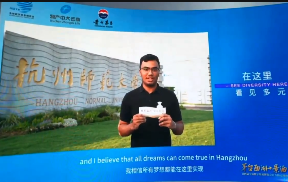 来自孟加拉国的贾小龙(JABER MOHAMMED HOSSAIN)是电子信息专业的研究生,他在数贸会现场利用生成式AI技术制作了一段杭师大宣传片,效果堪称专业。