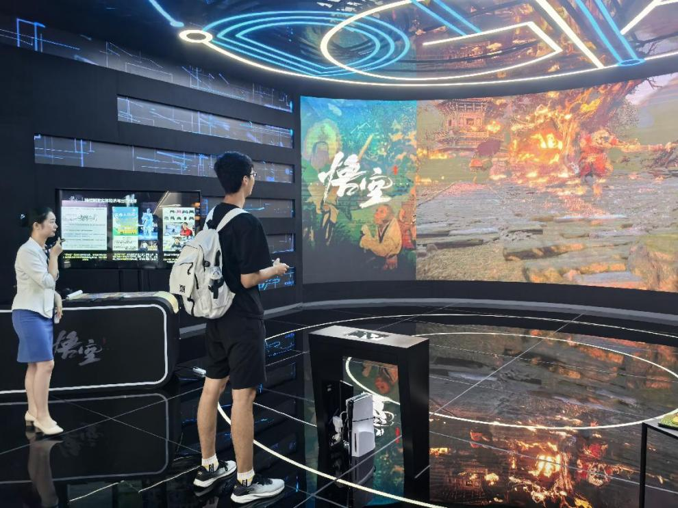 在杭州游科互动科技有限公司的展区,《黑神话:悟空》的游戏演示吸引了众多目光。同学们亲身体验这款国产3A大作的精彩画面与创新玩法,纷纷为其中展现的技术实力与文化内涵点赞。一位同学感叹道,“这不仅是一场视觉盛宴,更让我们看到了中国游戏产业的发展潜力。”