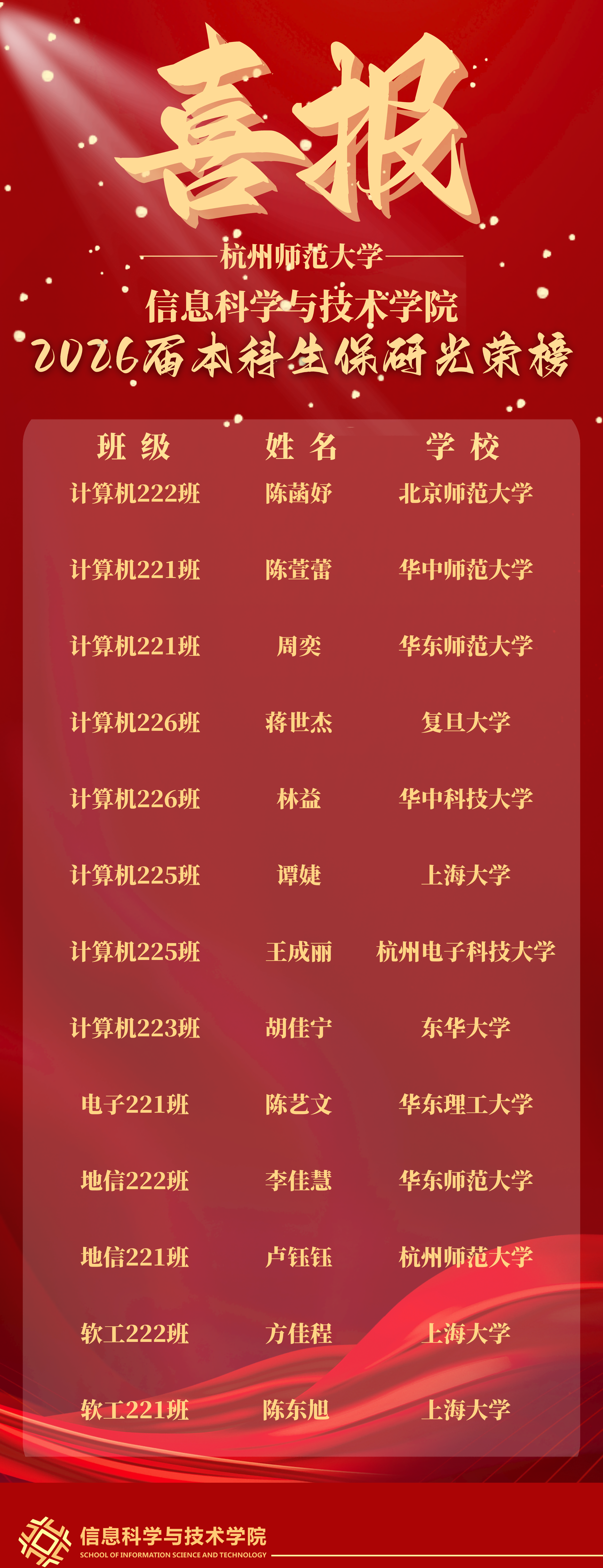 学院2026届本科毕业生推免工作顺利结束 时间:2025-09-30 10:00:00 文章来源 :学工办 浏览量:141 韶华作帆,扬起学子探索的志向;学识为桨,划开追梦路的波澜。追剧狂人 2026届保研学子们,以课堂的专注筑牢根基,用竞赛的拼搏积蓄力量,凭日积月累的卓越与坚守,终登理想院校之阶,为青春镌刻下浓墨重彩的勋章。愿这份荣耀榜单成为新的序章,感召更多学子以榜上同学为榜样,在信息科技的璀璨星河中找准航向,用扎实的专业能力筑牢根基,以远大的理想抱负书写新篇!