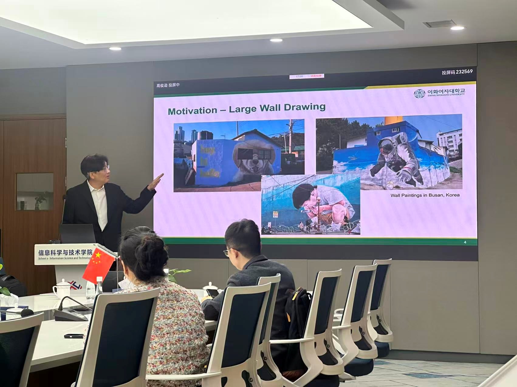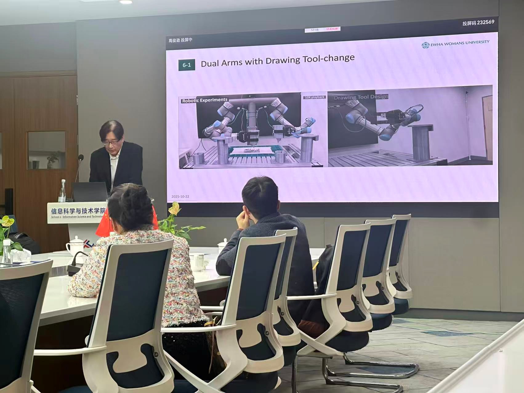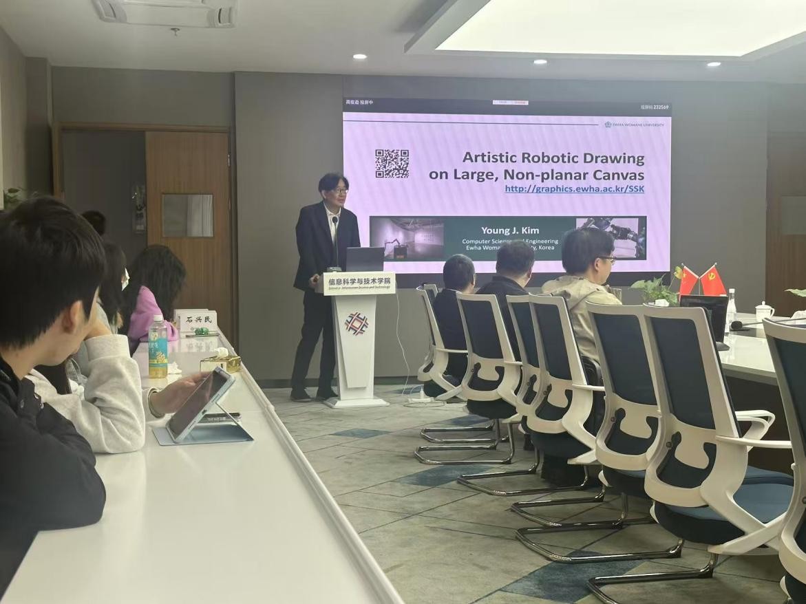 2025年10月23日上午,第13期IT讲坛在勤园12-304举行。梨花女子大学(Ewha Womans University)计算机科学与工程学全职教授金永俊教授担任主讲嘉宾,应邀做题为“Artistic robotic drawing on large, non-planar canvas”的精彩报告。学院刘复昌副教授主持讲座,多位老师与研究生参加。